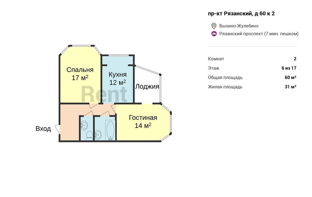 2-комнатная квартира: Москва, Рязанский проспект, 60к2 (60 м²)