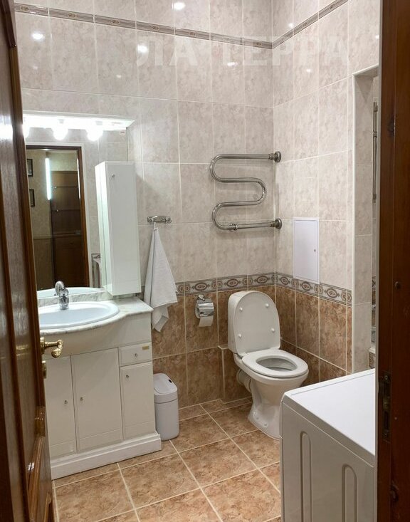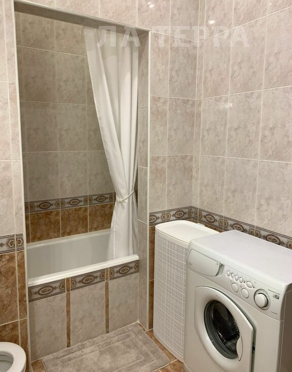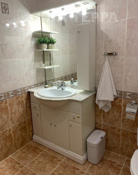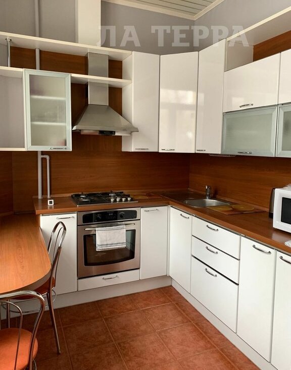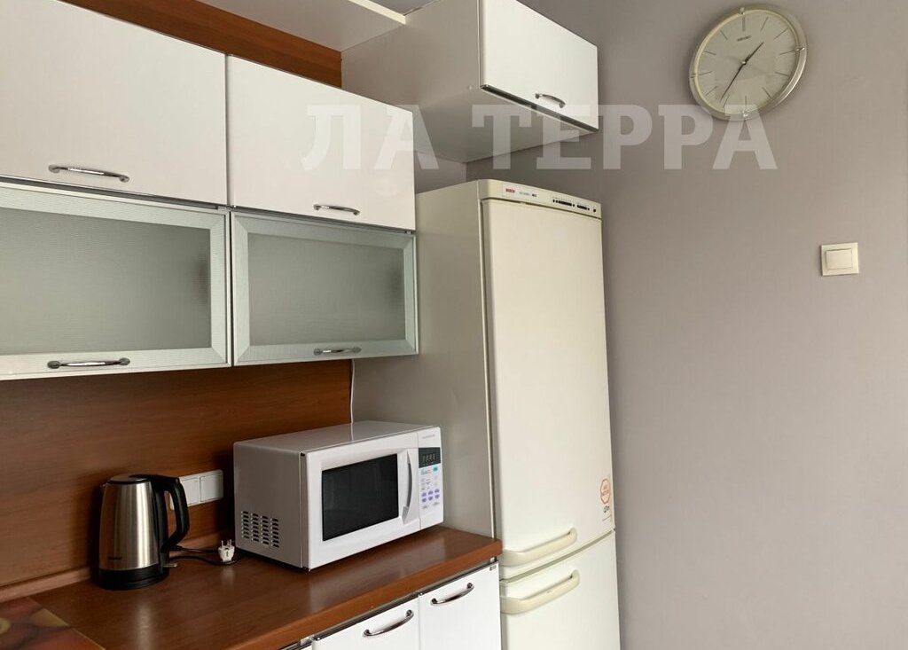 Кухня оснащена варочной панелью с духовкой, вытяжкой, имеется холодильник, микроволновая печь. Совмещенный санузел полностью облицован керамической плиткой. Оснащен стиральной машиной. Просторный коридор.