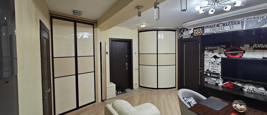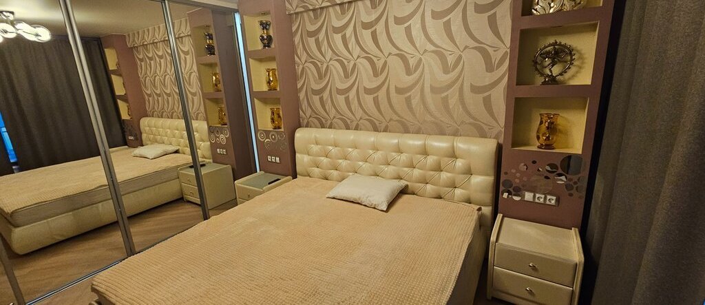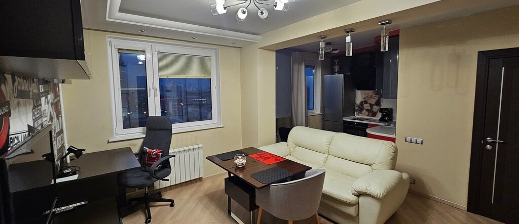 Квартира полностью обставлена мебелью и готова к заезду жильцов! Есть просторная гардеробная, обувница, два шкафа, кровать 2х2, раскладной двуспальный диван, обеденный стол, рабочее место, вся необходимая сантехника, стиральная машина, 2 телевизора, 2 кондиционера.