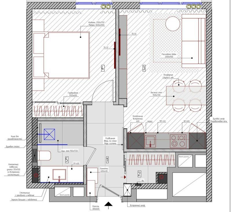 Встроенная техника: холодильник, СВЧ, духовой шкаф, варочная поверхность, стиральная и посудомоечная машина.