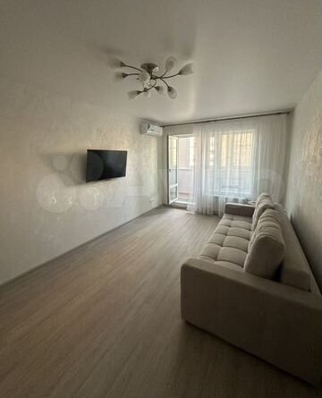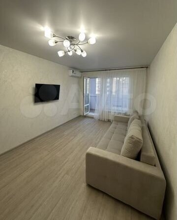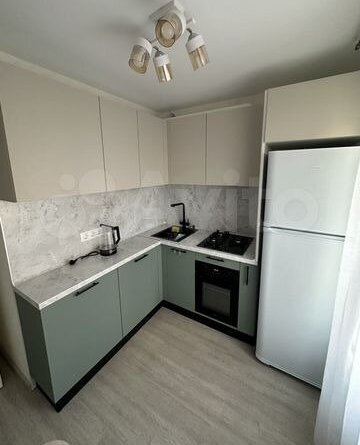 Кухня оборудована новой техникой: холодильник, варочная панель, духовой шкаф, чайник и современная мебель. В гостиной установлен кондиционер и телевизор, а также удобный диван и шкафы для хранения вещей.
