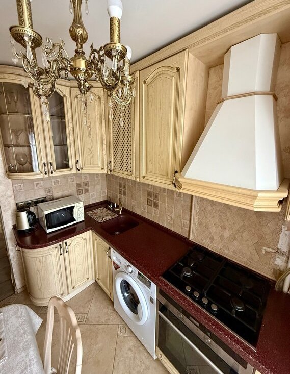 Есть вся необходимая техника: телевизор, стиральная машинка, микроволновка, холодильник, чайник, утюг, газовая плита и духовой шкаф, кондиционер.