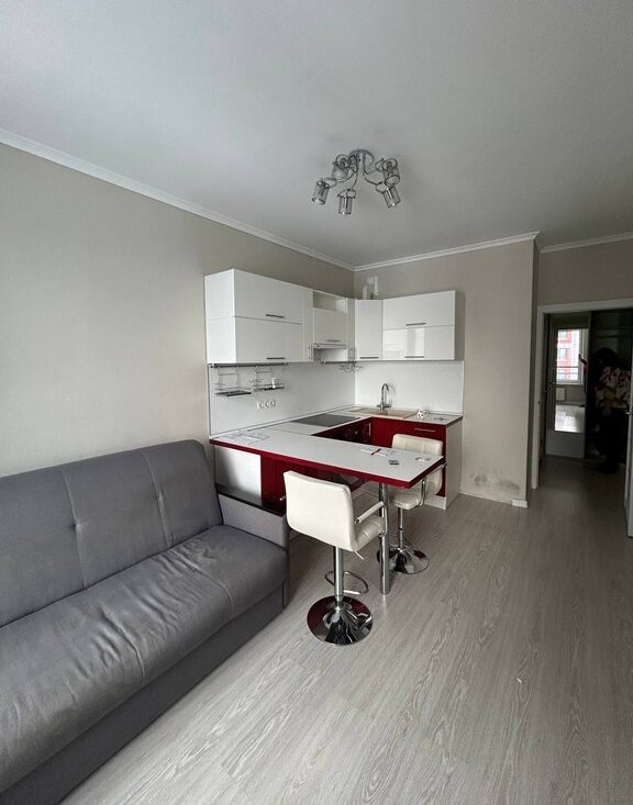 Евродвушка, одна комната изолированная, вторая совмещена с кухней. Дополнительная мебель приобретается собственником под потребности арендатора. В стоимость включены все платежи, сверху только счётчики на электричество и воду.