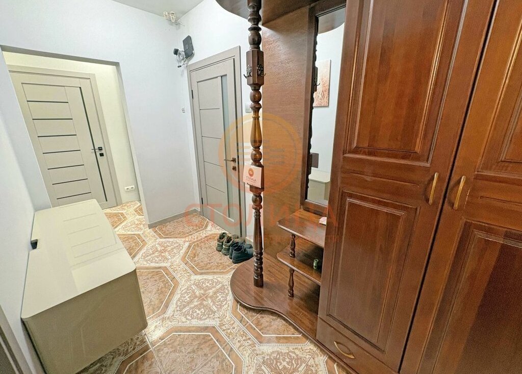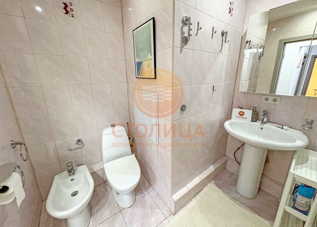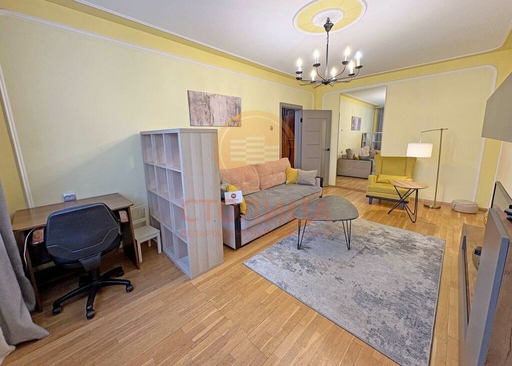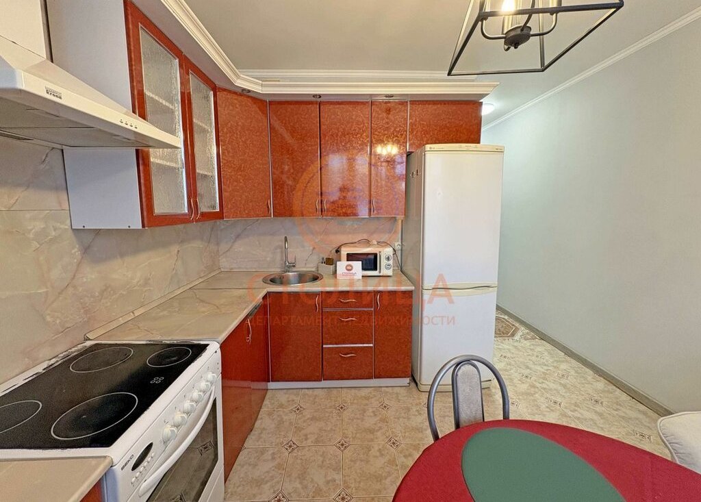 Квартира полностью меблирована и готова к проживанию: всё необходимое для жизни и работы уже есть. В спальне вас ждёт комфортная двуспальная кровать и вместительный шкаф, в гостиной — уютный диван, кресло, компьютерный стол, телевизор и кондиционер. На кухне имеются стол и стулья, а в коридоре установлен вместительный шкаф‑купе и небольшая гардеробная.