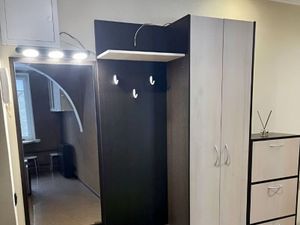 Комната + кухня мебель: кожаный диван Ikea, новое кресло Hoff, новый пуфик Hoff, новый журнальный стол Hoff, два барных стула мягких Hoff, барная стойка на заказ с подсветкой, кухня Ikea с встроенной плитой Zanussi и духовкой Whirpool (посуда, бокалы), вытяжка с подсветкой Maunfeld, большой зеркальный шкаф для одежды и обуви с полками, теплый пол, Тв 43 дюйма