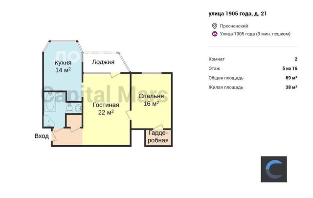 2-комнатная квартира: Москва, улица 1905 года, 21 (69 м²)