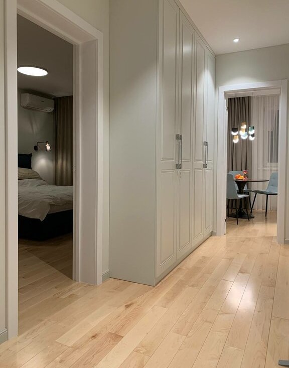 Три больших шкафа - нет недостатка в местах для хранения. Встроенная мебель под заказ.