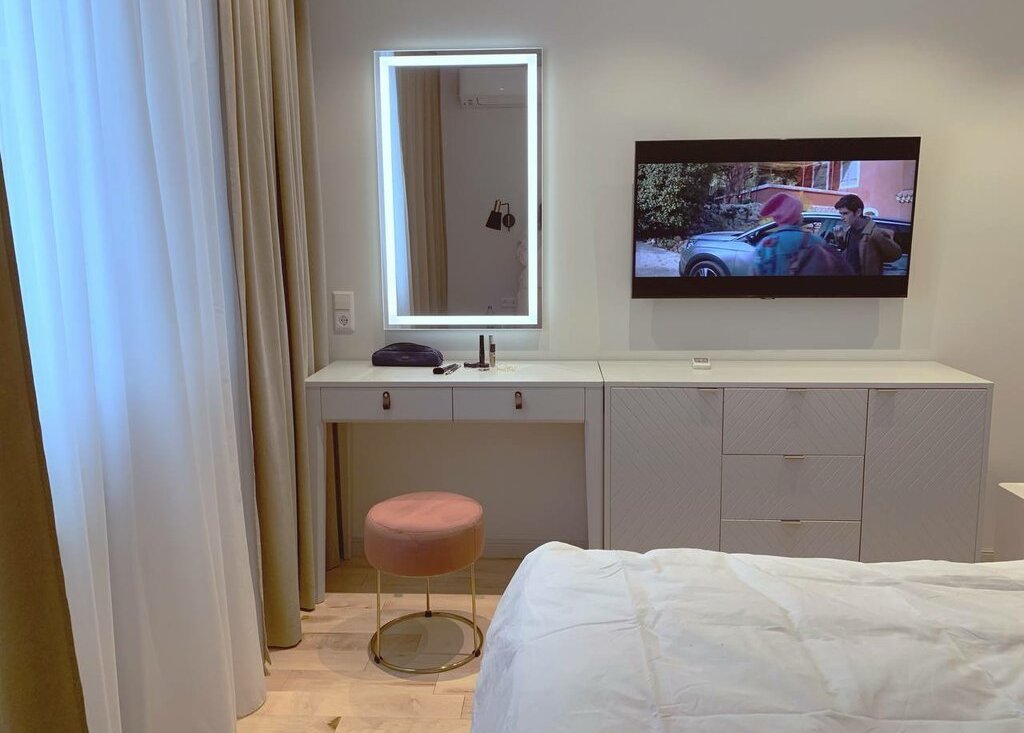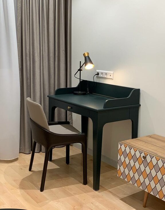 Один рабочий столик в гостиной, можно работать, и один столик в спальной, тоже можно работать, если нужно.