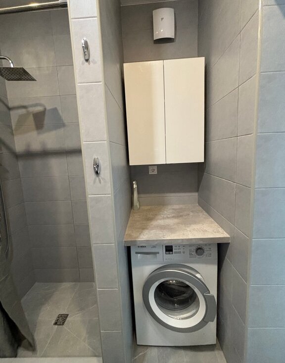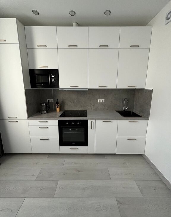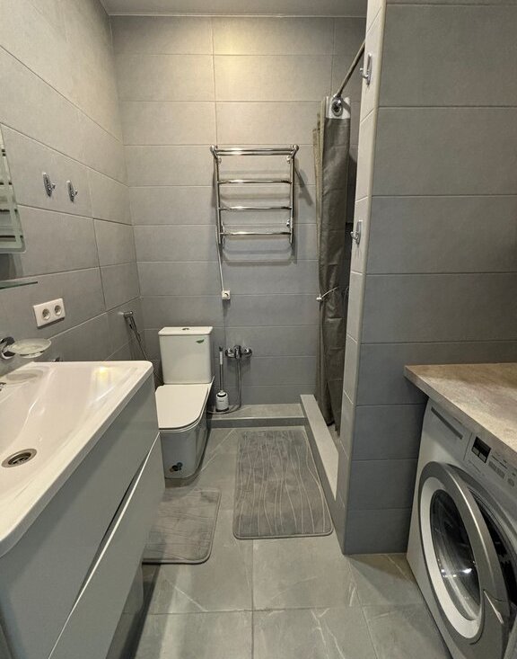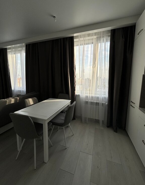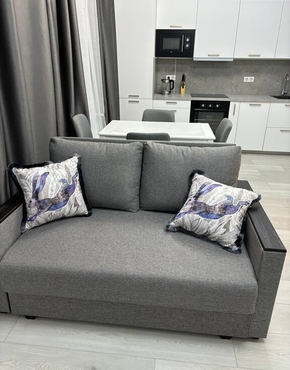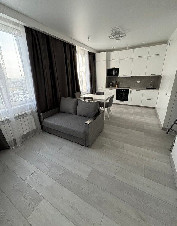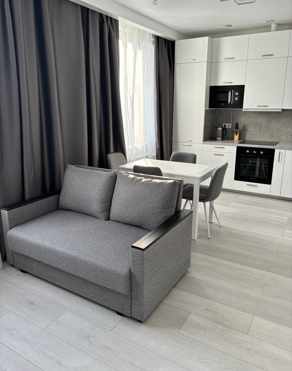 Удобная планировка. Кухня-гостиная с полным набором мебели и встроенной техники ( электроплита, холодильник, микроволновая печь), санузел с душевой кабиной и стиральной машинкой, телевизор и кондиционер. Большое колличество светлых окон по всей протяженности стены. Общая площадь 38.9 кв.м. Рядом вся социальная инфраструктура, сетевые магазины, кафе и рестораны. Отличная транспортная доступность, до метро