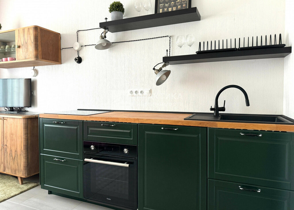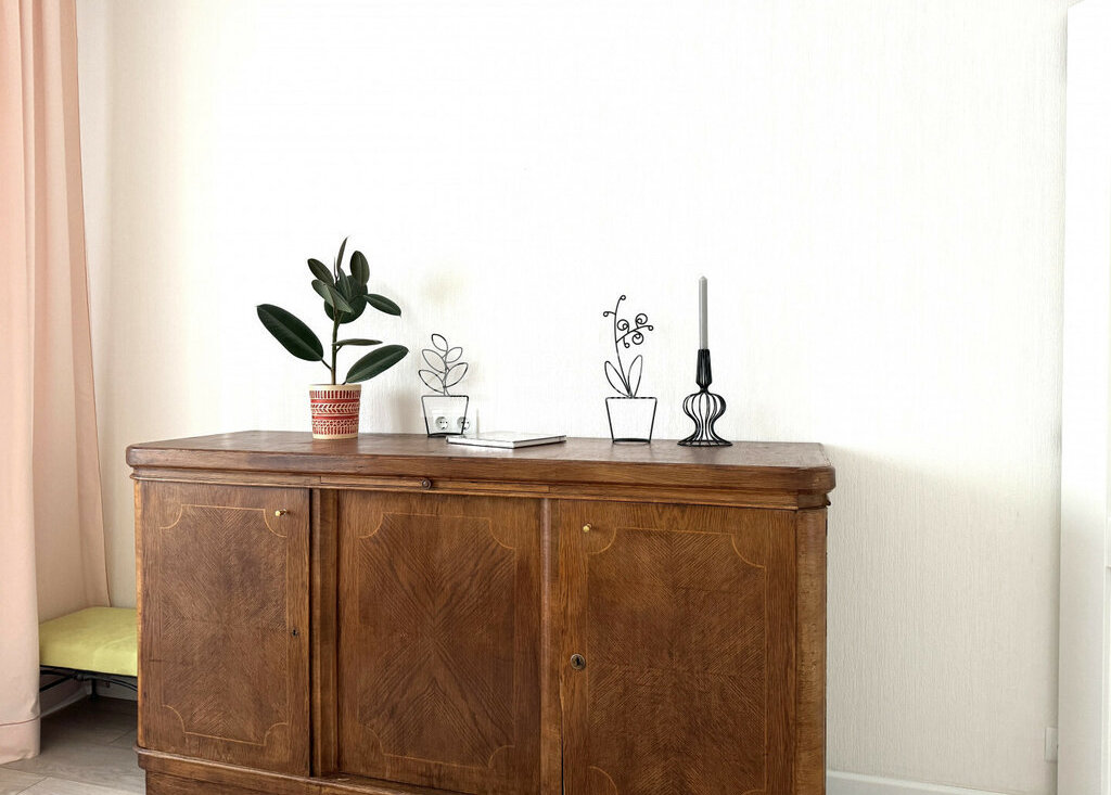 Собственники подбирали мебель с любовью: новая функциональная на кухне и в спальне + отреставрировали стильную винтажную из натурального дерева.
