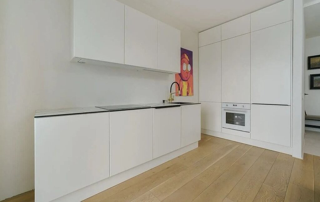 Вся кухонная техника спрятана за большими дверцами кухонного шкафа (wing linе). Когда ничего не нужно готовить, то вы закрываете дверцы и шкаф «растворяется» на стене. Кухня выполнена из МДФ, покрыта матовой эмалью, вся фурнитура блюм.