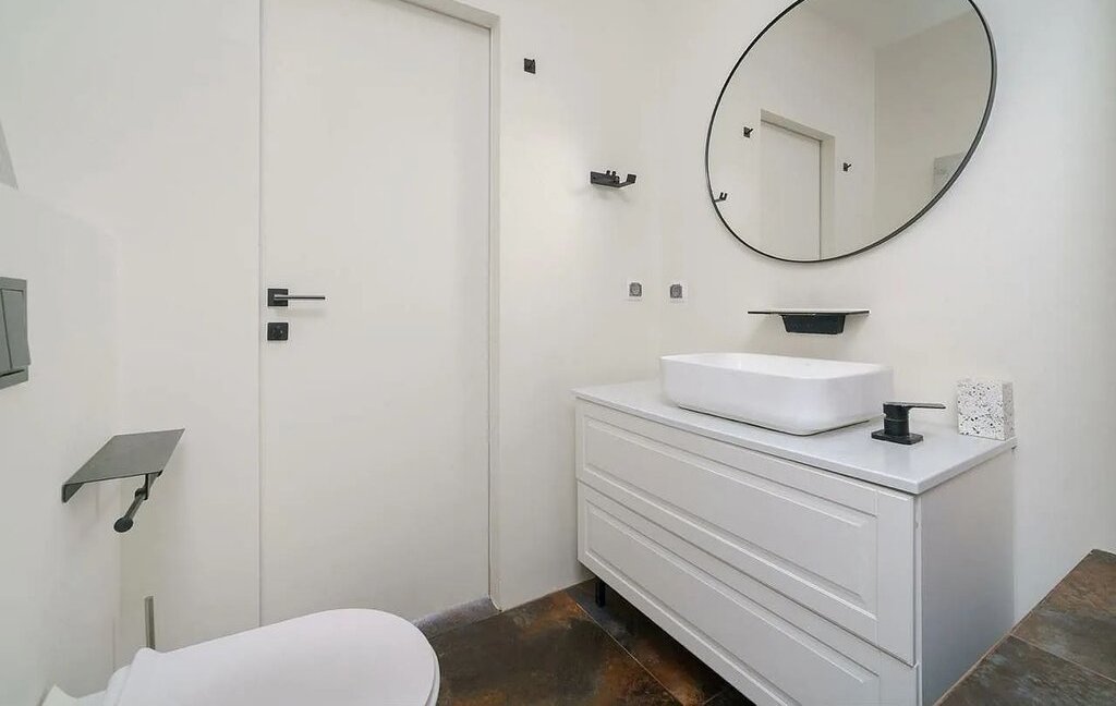 Ванная комната компактная, но при этом вместительная и функциональная. Под раковиной большая тумба, с глубокими выдвижными ящиками, есть гигиенический душ.