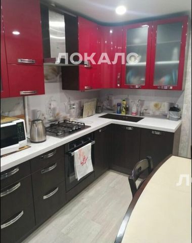 На кухне гарнитур, производства Стильные кухни. Есть всякий необходимая бытовая техника: посудомоечная машина, вытяжка, микроволновая печь, электрический чайник, газовая плита, духовой шкаф, холодильник.
