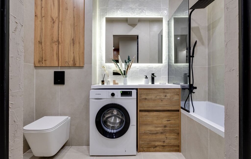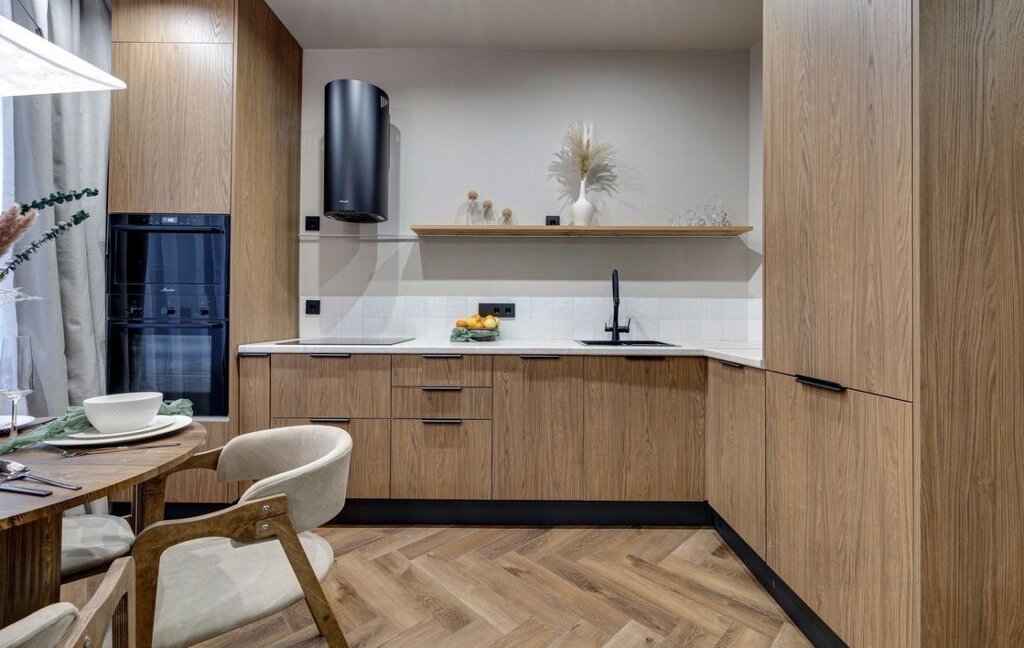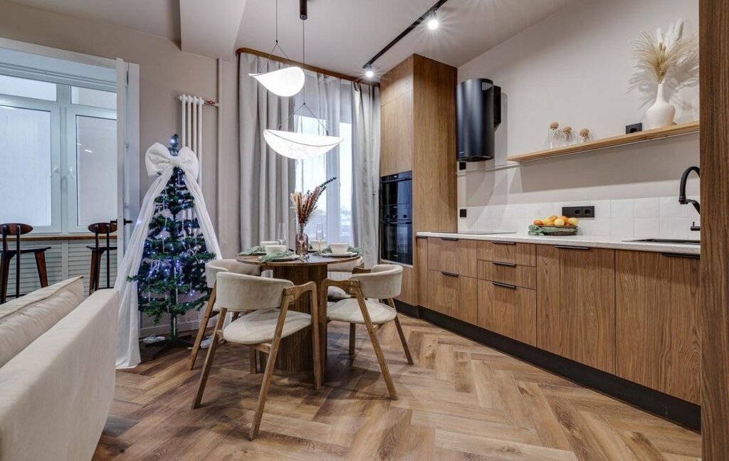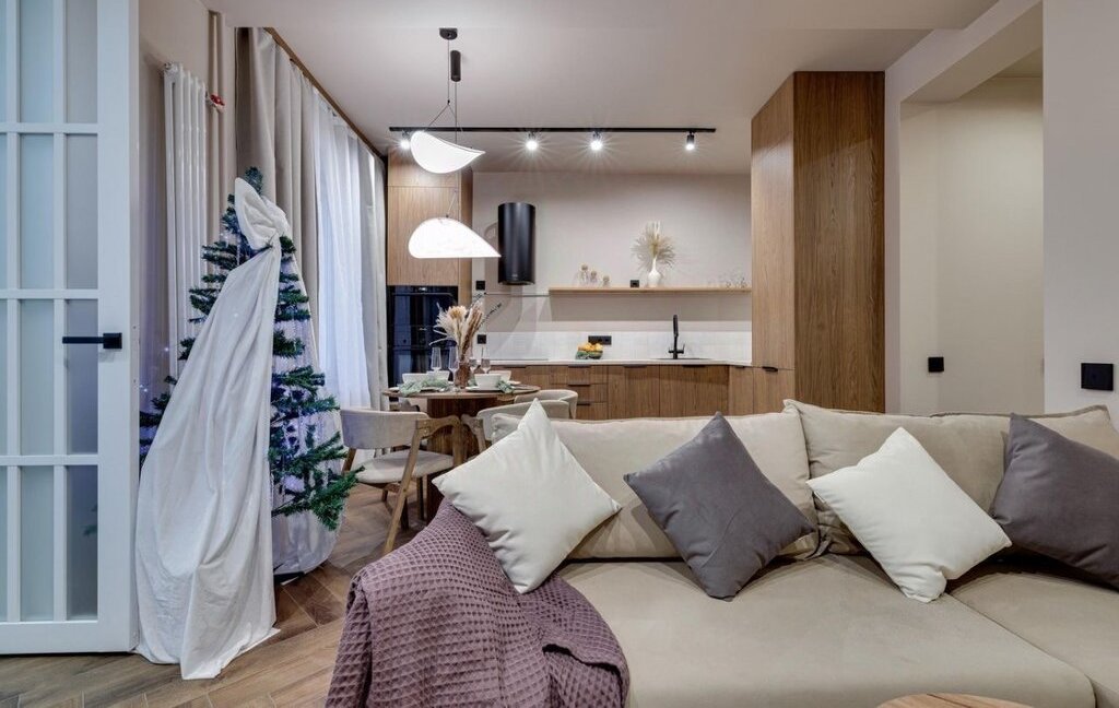 Кухня-гостиная объединяет функциональную зону приготовления пищи и пространство для отдыха. В гостиной установлен диван с возможностью трансформации в полноценное спальное место.