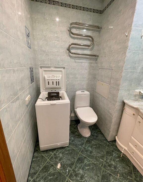 Просторный санузел с большой ванной, стиральная машина.