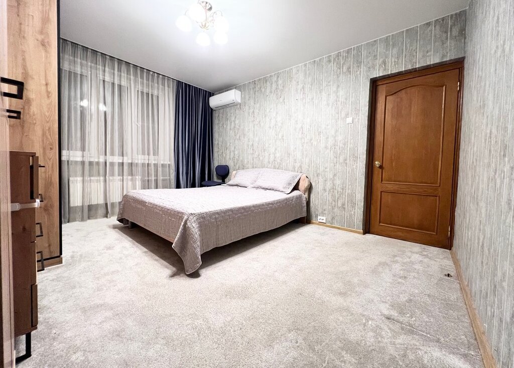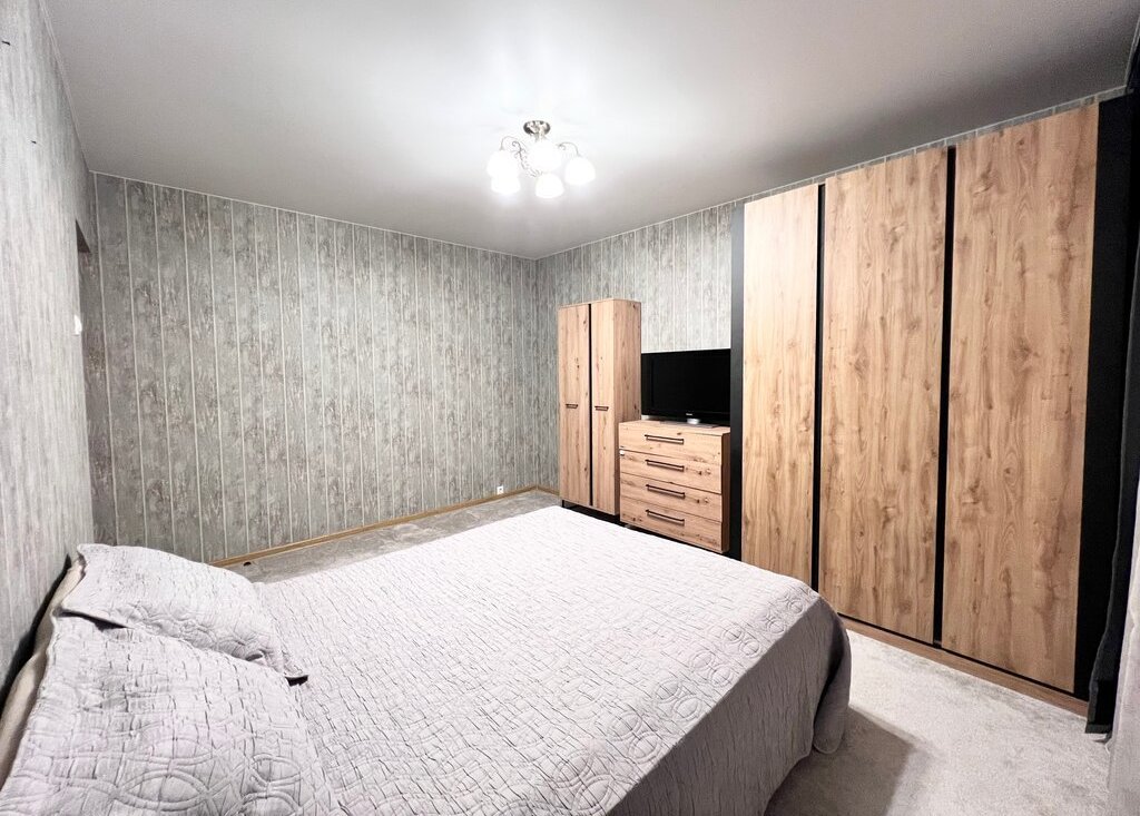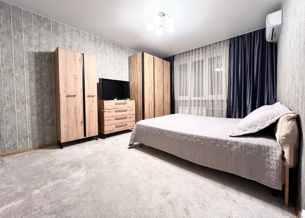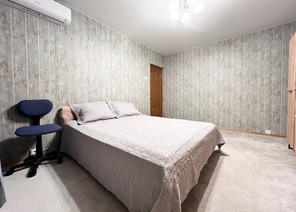 Спальня 15 кв м: двуспальная кровать с ортопедическим матрасом, 2 платяных шкафа, комод, ТВ Philips, офисный стул, кондиционер Hisense.