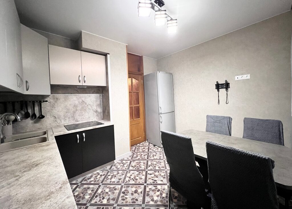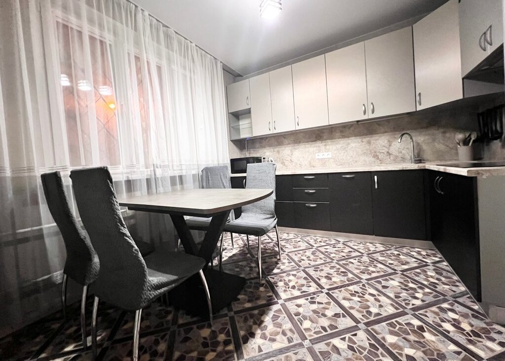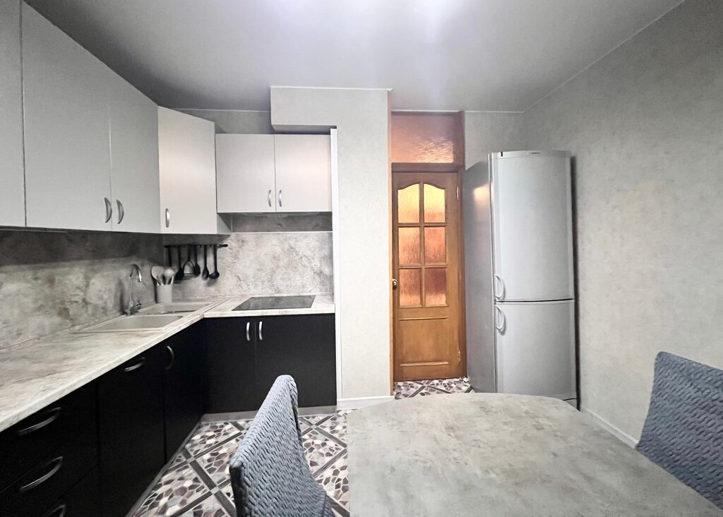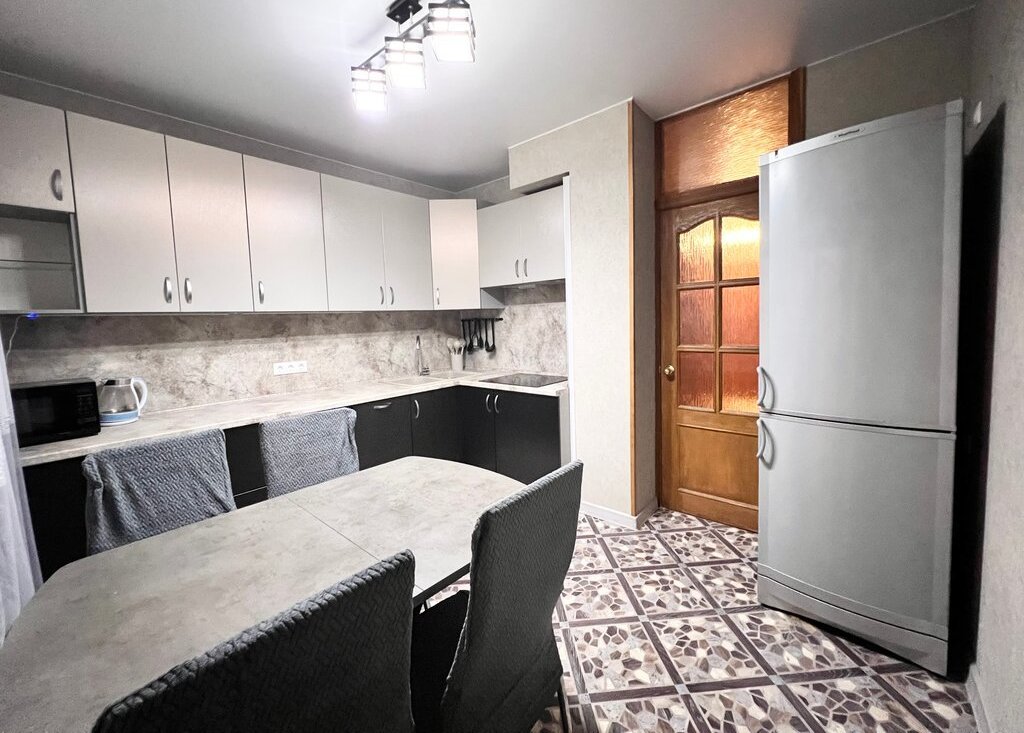 Кухня 10 кв м: встроенный кухонный гарнитур с бытовой техникой: сенсорная варочная панель Electrolux, посудомоечная машина Electrolux, вытяжка Crona, холодильник Vestfrost, микроволновка LG, чайник Zigmund & Shtain, обед стол, 4 стула.