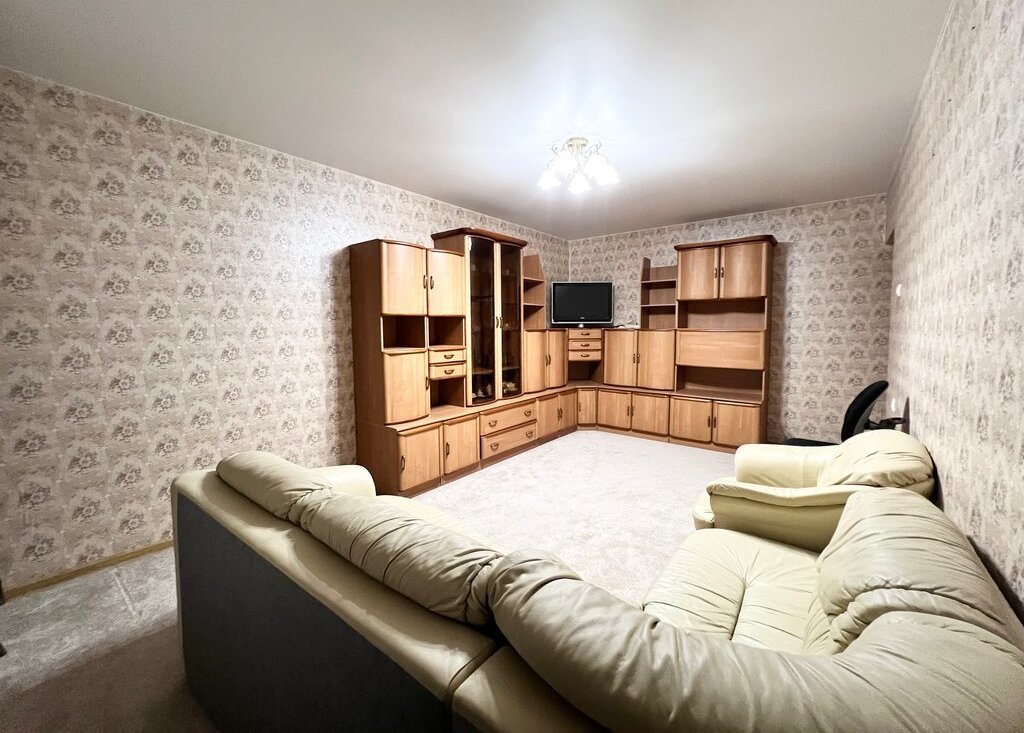 Гостиная 20 кв м: диван двуспальный угловой раскладной, стенка, ТВ Phillips, офисный стул.