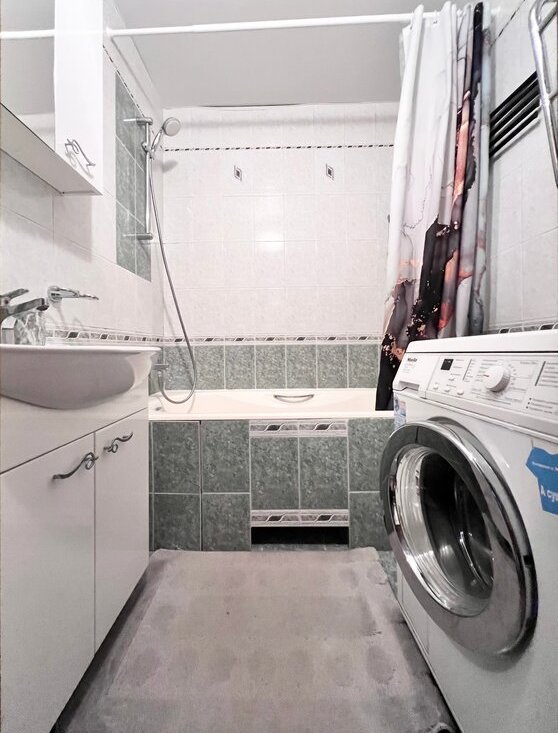Ванная: стиральная машина Miele, проточный нагреватель воды (на случай отключения). Раздельный санузел. Прихожая: шкаф 4х створчатый, шкаф-прихожка, комод, обувница, пылесос Miele. Заст и утепл лоджия: шкаф, тумбочка, пуфик,