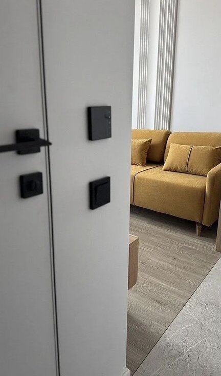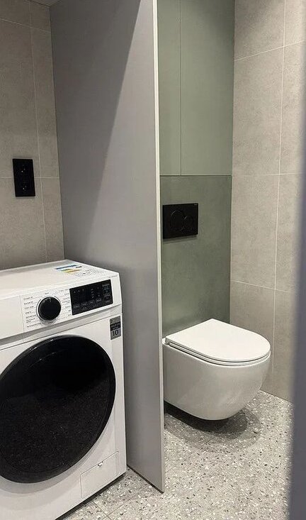 - Вся необходимая техника уже встроена: стиральная машина, индукционная плита, духовой шкаф, кондиционеры в каждой комнате и кухне-гостиной, посудомоечная машина и встроенный холодильник.
