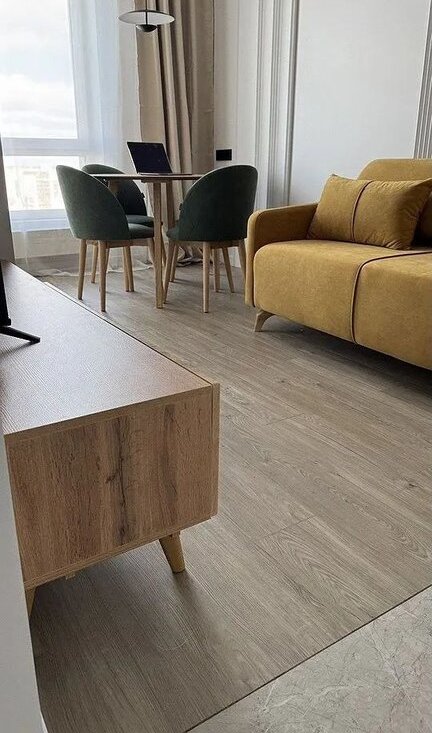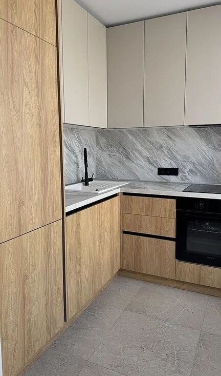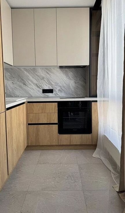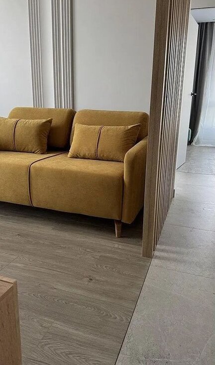 - Кухня-гостиная объединена в просторную зону с раскладным диваном, что делает ее идеальной для приема гостей или семейных вечеров;
