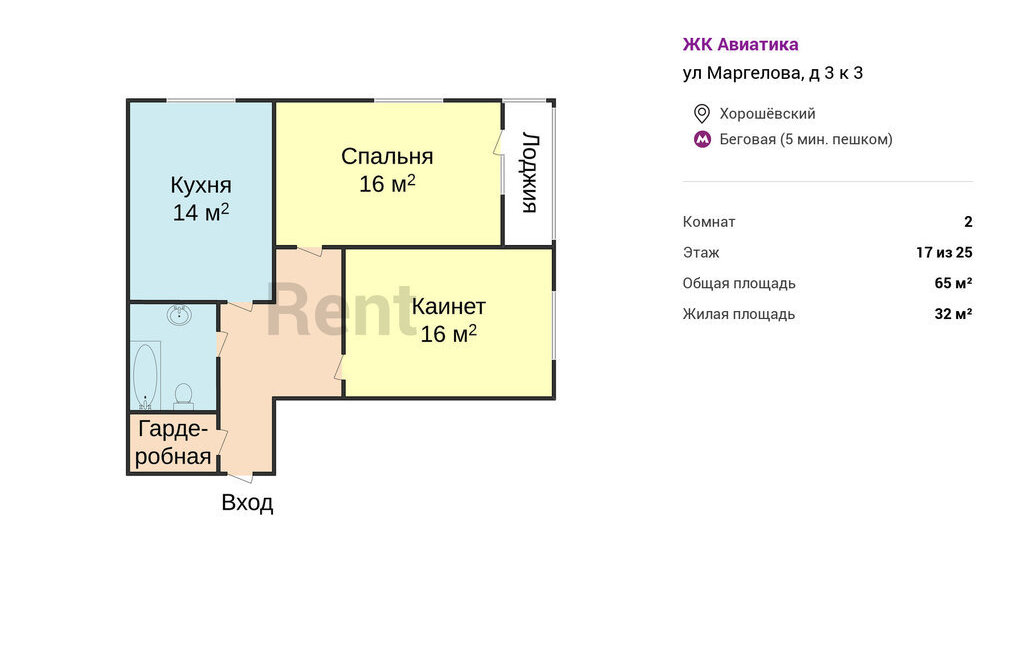 Предлагается 2-комнатная квартира общей площадью 65 м² в ЖК "Авиатика" недалеко от станции метро "Беговая". Для комфортного проживания в наличии имеется вся необходимая мебель. Кухонный гарнитур оснащен посудомоечной машиной, духовой печью. Для удобства организована гардеробная комната. Из дополнительных преимуществ - наличие балкона. Окна обращены на улицу.