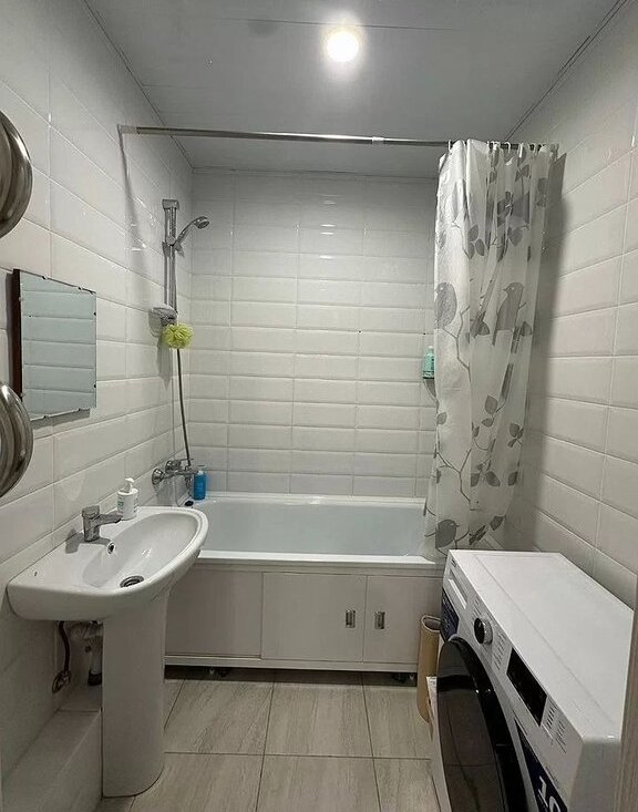 Кухня оборудована всем необходимым: холодильник, плита, микроволновая печь и стиральная машина. Просторная гостиная с диваном и телевизором, а также обеденная зона с современным столом и стульями. В спальне установлен удобный диван и вместительный шкаф.