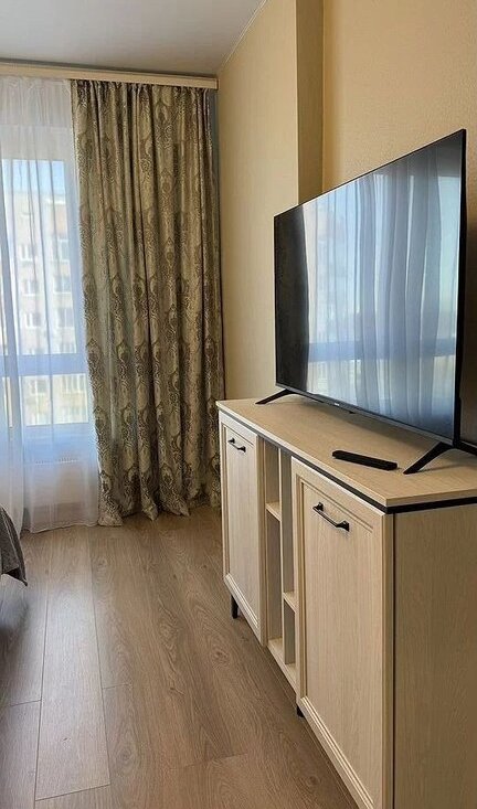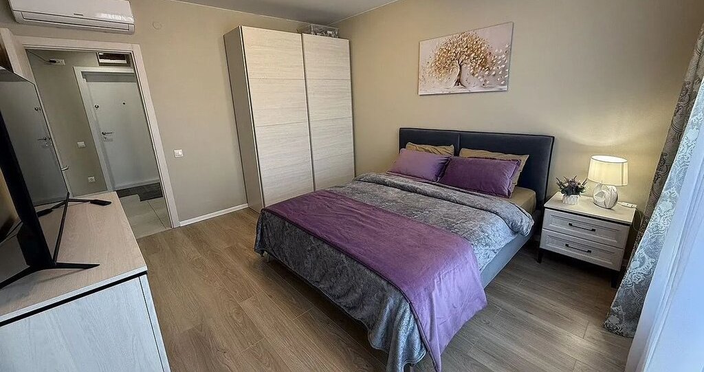 -В спальне имеется большой вместительный шкаф,кровать с ортопедическим матрасом,телевизор и кондиционер.