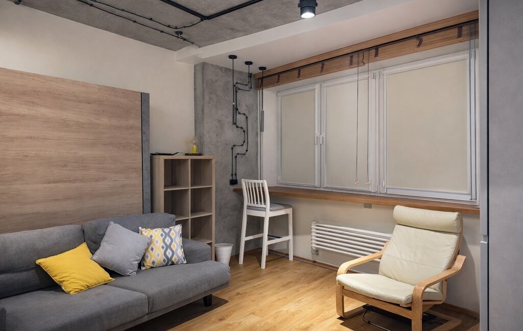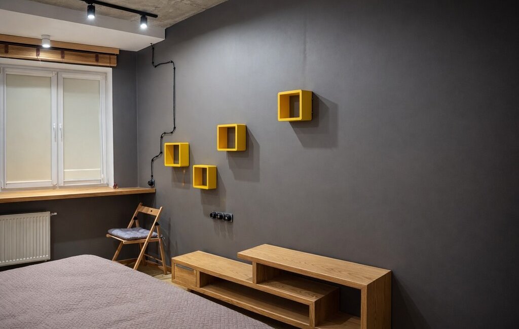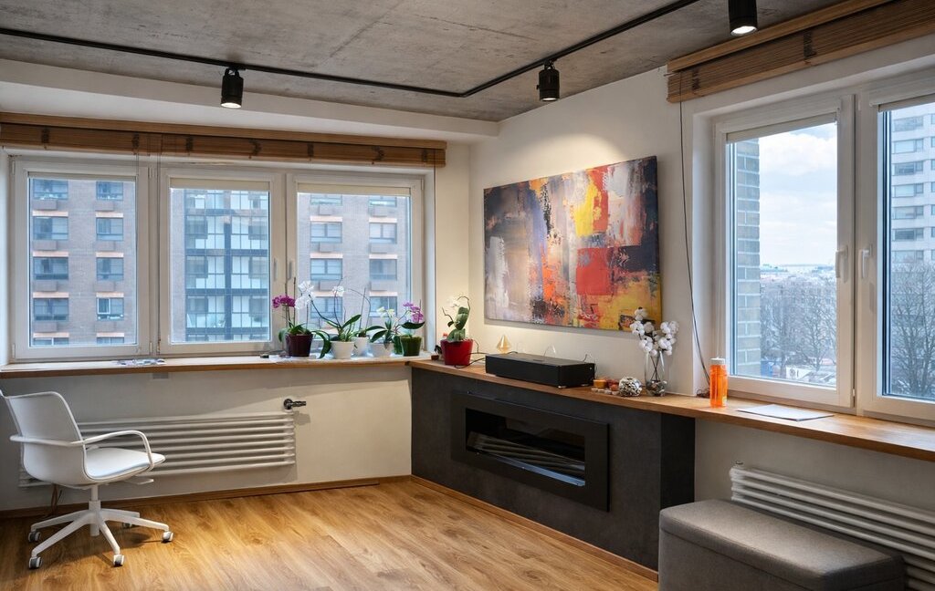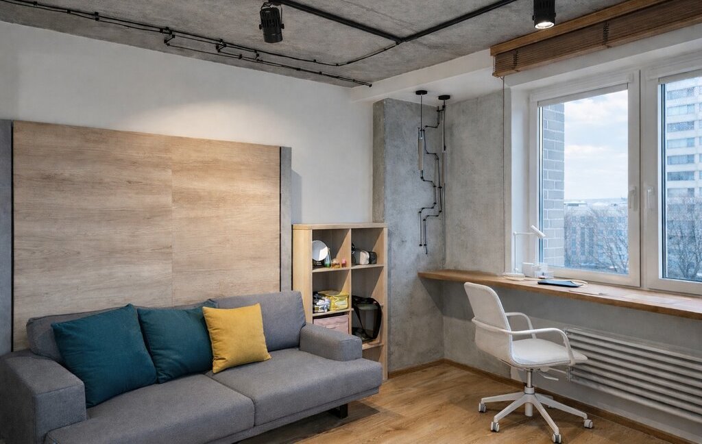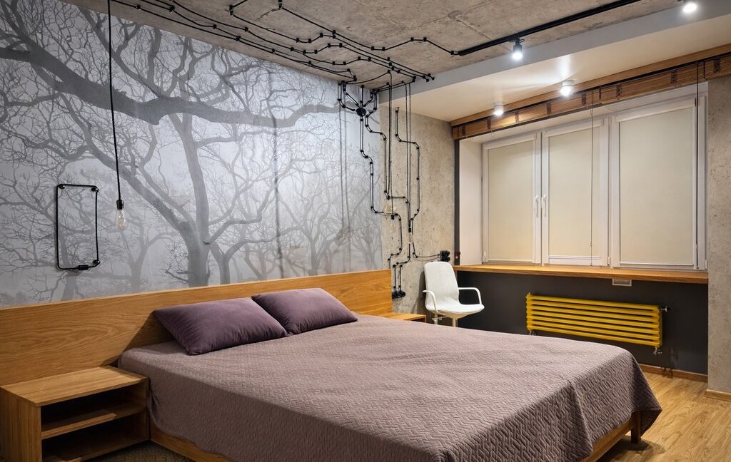 Квартира выполнена в современном стиле с элементами индустриального дизайна: бетонные фактуры, дерево, трековое и точечное освещение, акцентные детали. Большие окна делают пространство светлым и уютным в любое время года 🌿