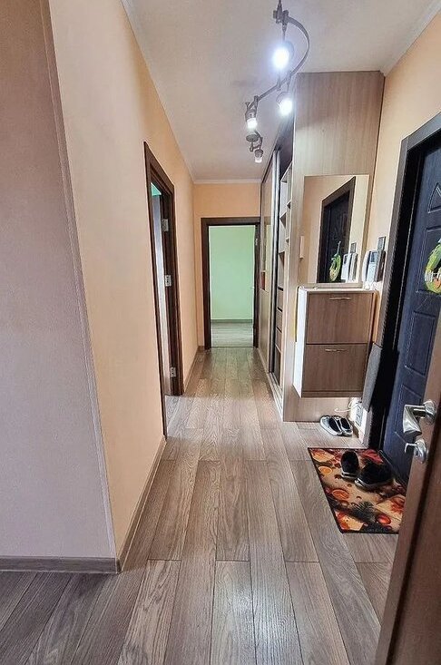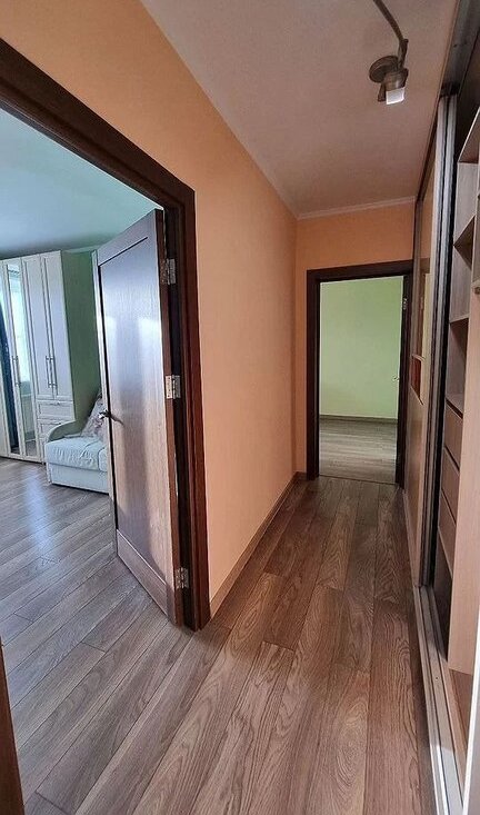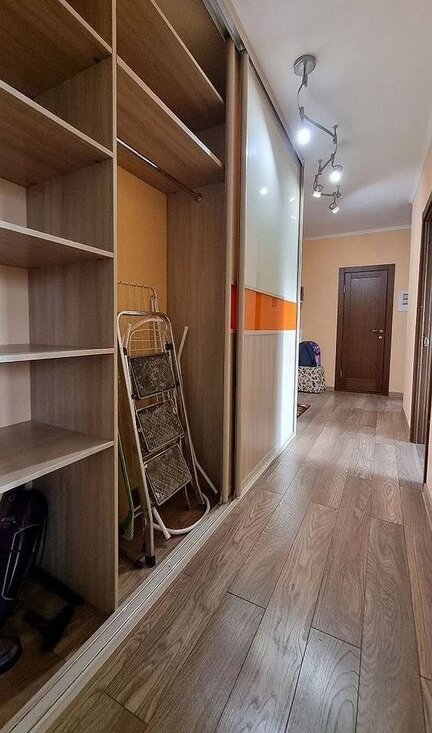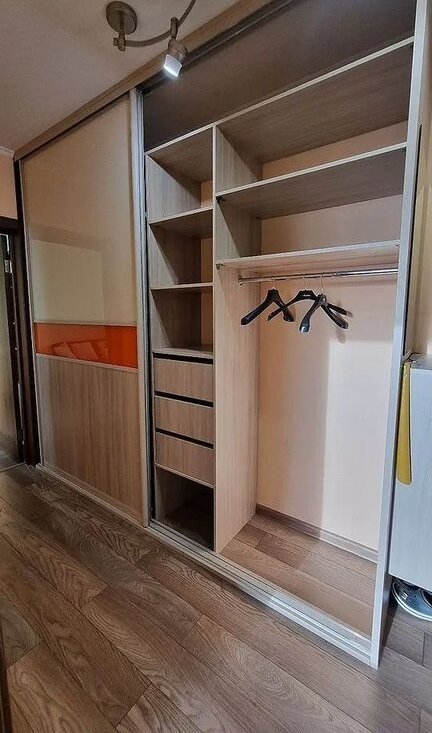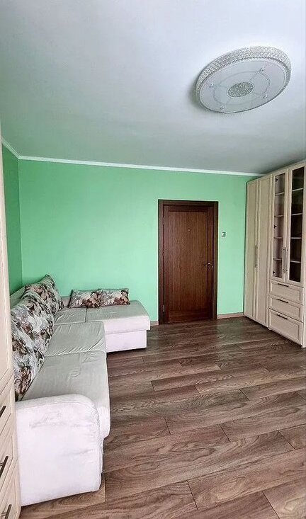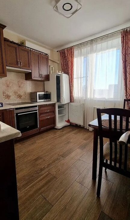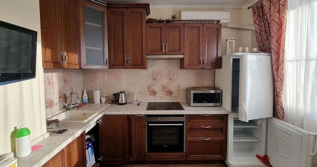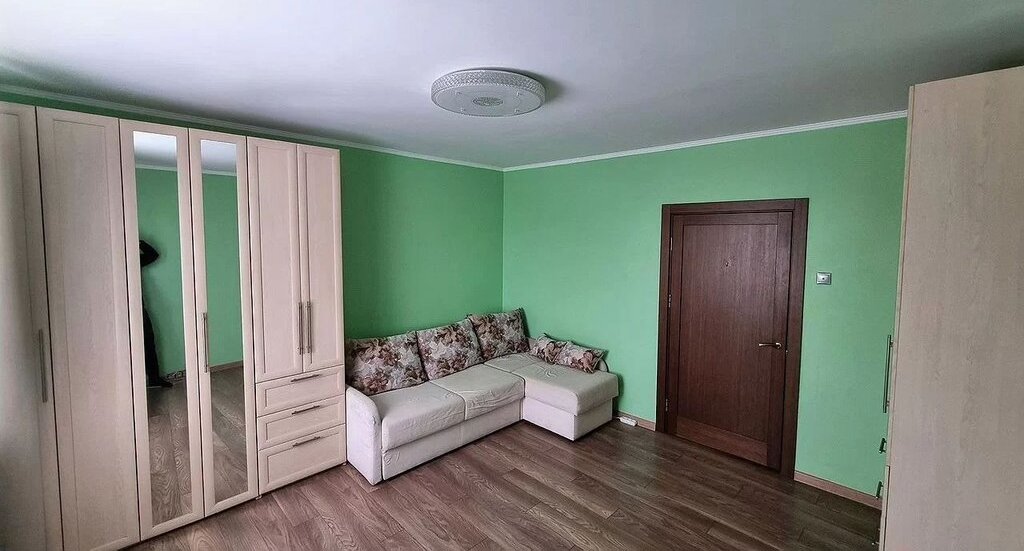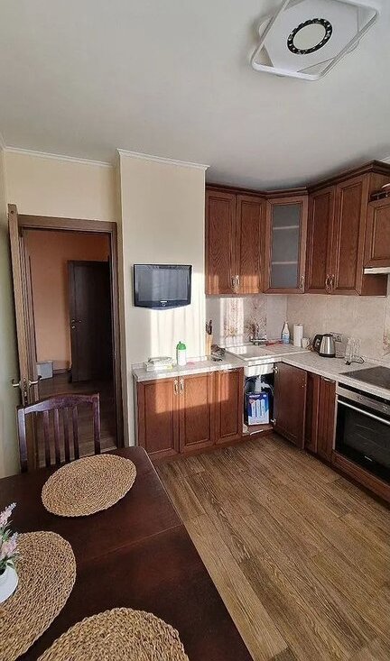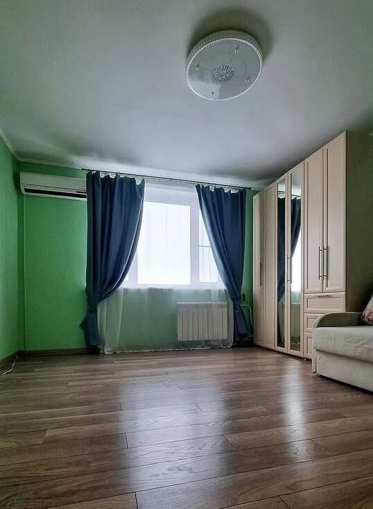 Квартира полностью готова для комфортного проживания: есть диван-кровать, шкафы, гардероб, детская мебель в маленькой комнате. Кухня полностью