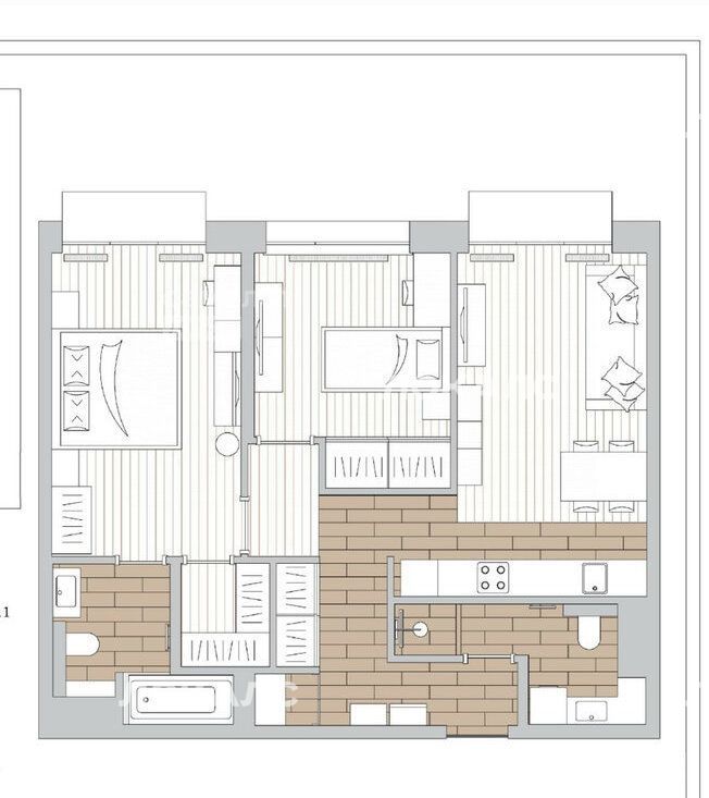 Функциональная планировка: кухня-гостиная, и две спальни, санузел с ванной.