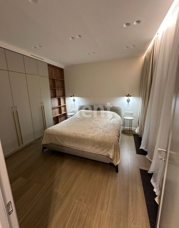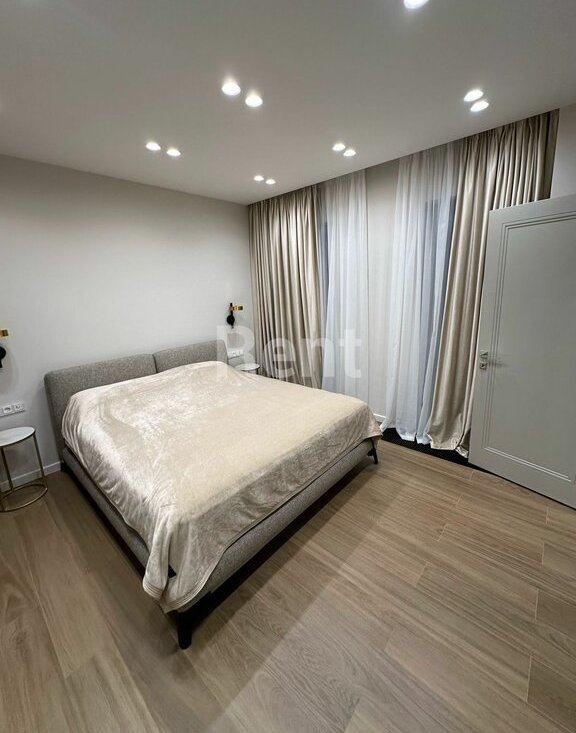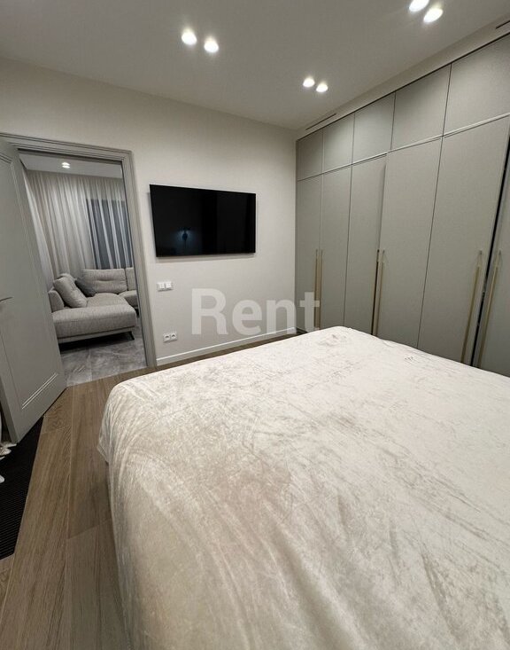 Планировка продумана и удобна: отдельная спальня и просторная кухня-гостиная. Общая площадь — 56 м². Высокие потолки усиливают ощущение пространства и света. Интерьер выполнен в современном стиле, спокойный и аккуратный, без лишних деталей.