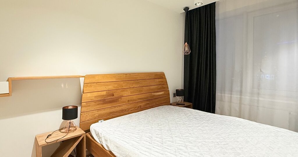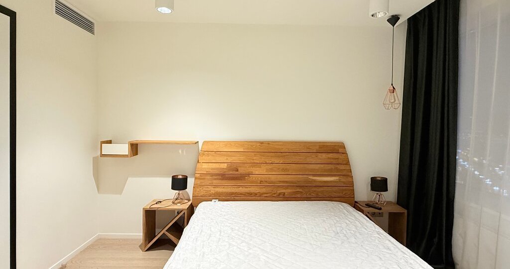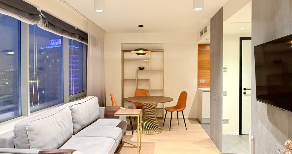 Квартира привлекает дизайнерским ремонтом и продуманной планировкой. В двух комнатах создана уютная атмосфера, благодаря стильной мебели и современным элементам декора. Кухня оснащена всем необходимым: холодильник, посудомоечная машина и кондиционер. В апартаментах также есть телевизор и стиральная машина. Санузел разделен на ванную комнату с душевой кабиной и отдельный туалет.