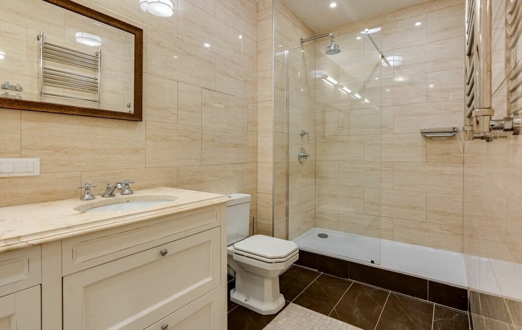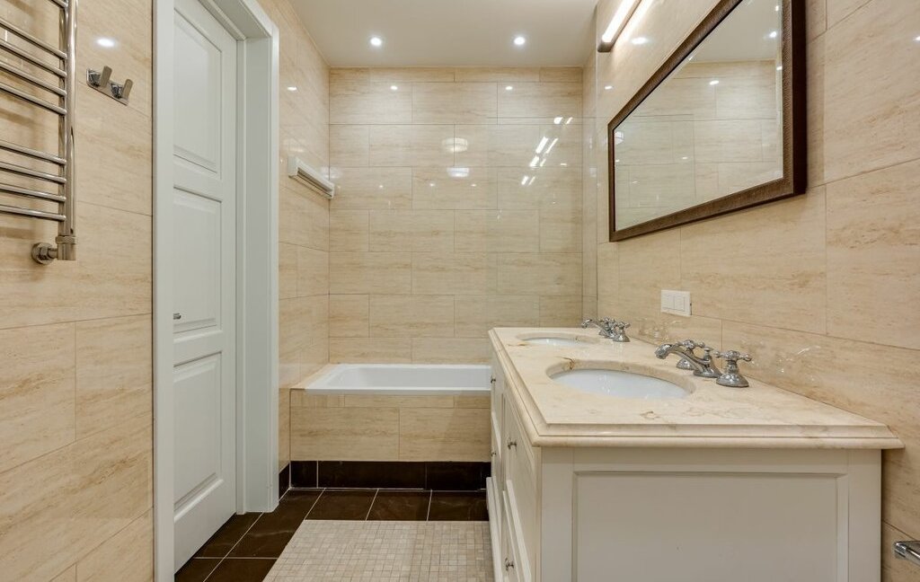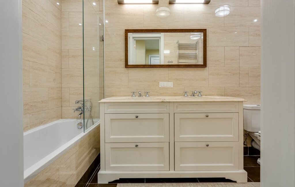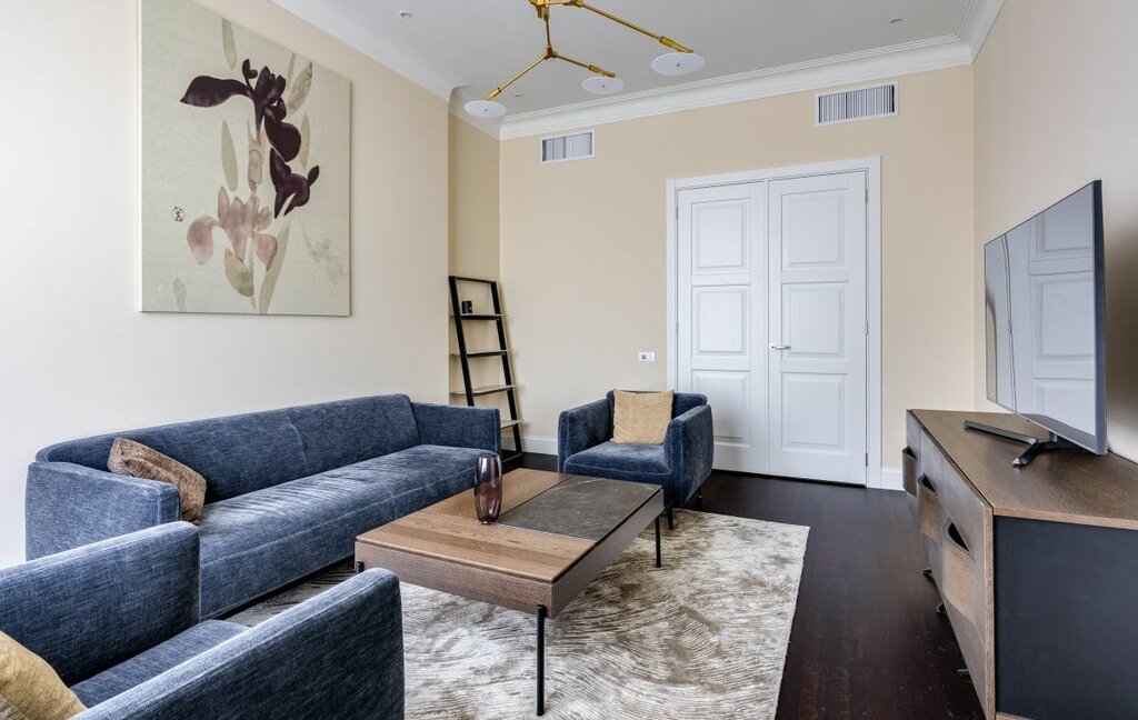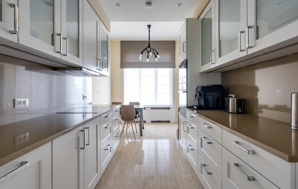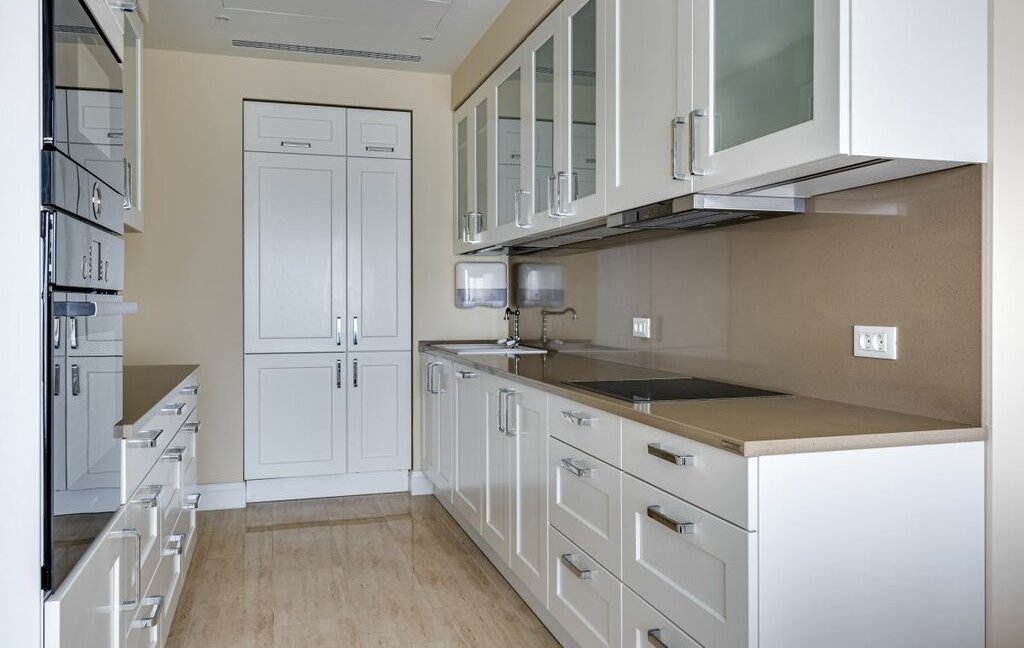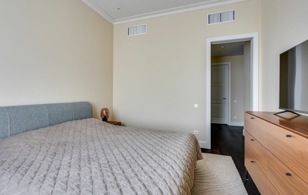 Мастер-спальня со своим санузлом (оборудован душевой и ванной) и просторной, вместительной гардеробной. Гостиная отделена от достаточно просторной кухни, оборудованной всем необходимым, вплоть до посуды и кофеварки.