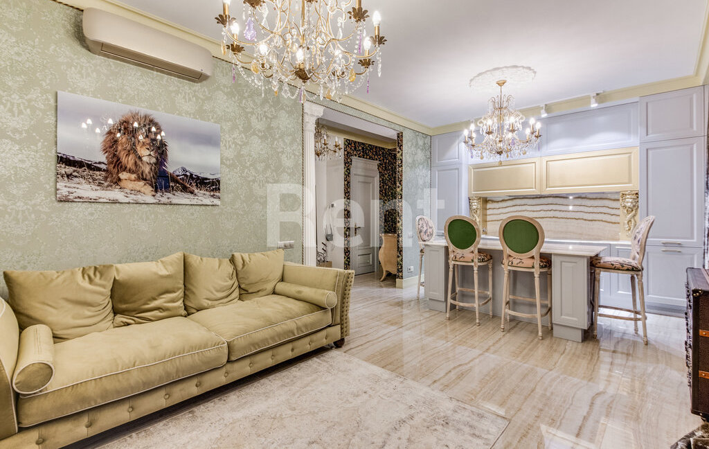 В малоквартирном доме недалеко от Пречистенской набережной предлагается двухкомнатная квартира с роскошным интерьером и видом на Храм Христа Спасителя. Выполнен дорогой ремонт: в оформлении использованы мрамор и оникс, в гостиной функционирует электрокамин. Кухонная зона оснащена встроенной техникой, включая посудомоечную машину. Большая ванная комната плавно перетекает в балкон с панорамным остеклением, откуда открывается живописный вид на ухоженный двор. Установлены системы подогрева пола и кондиционирования.