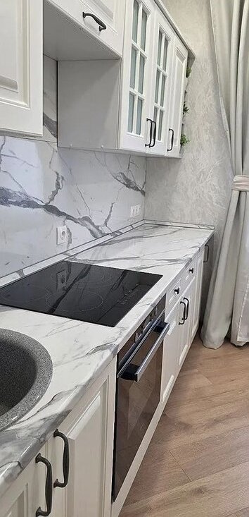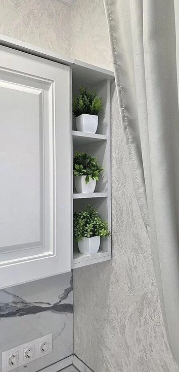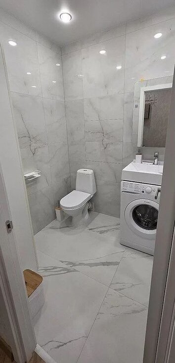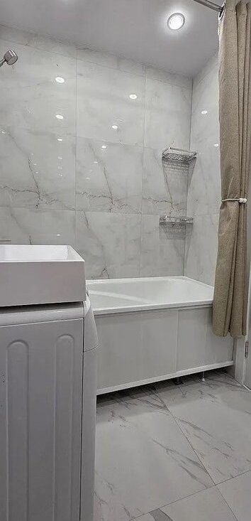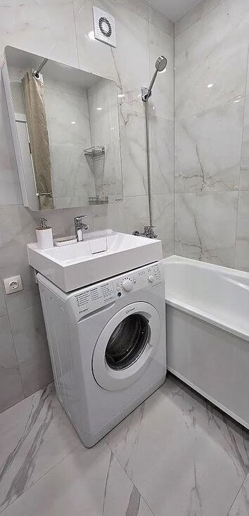 Кухня оборудована современной техникой, включая холодильник и стиральную машину. Ванная комната совмещённая, оформлена в светлых тонах и оснащена ванной.