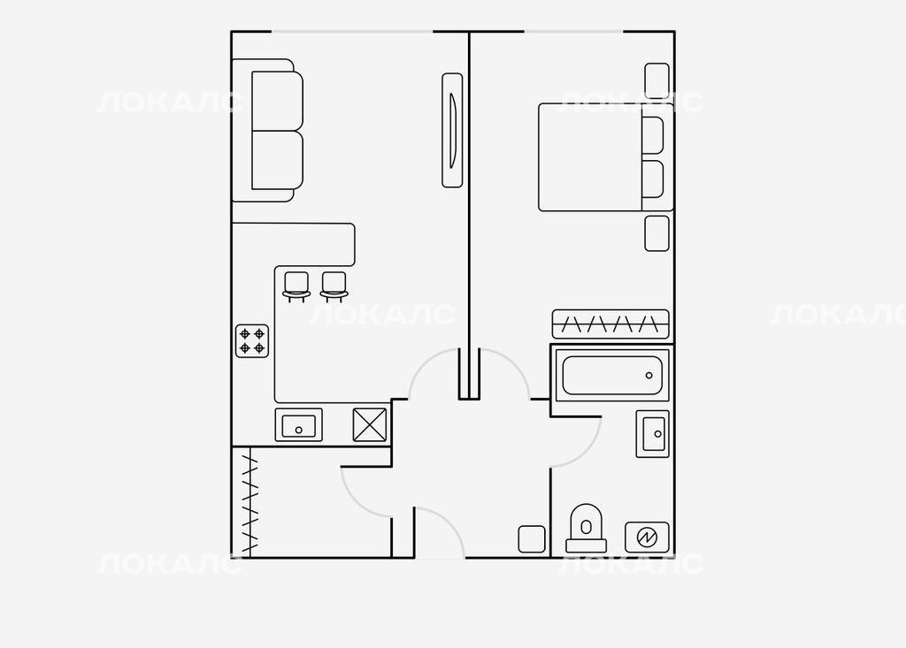Просторная, 2-комнатная квартира №3036 с гардеробной, евро- планировка (кухня-гостиная + спальня+ санузел), с высокими потолками, площадью 43 м2, расположенная на третьем этаже нового арендного дома Матч Поинт.