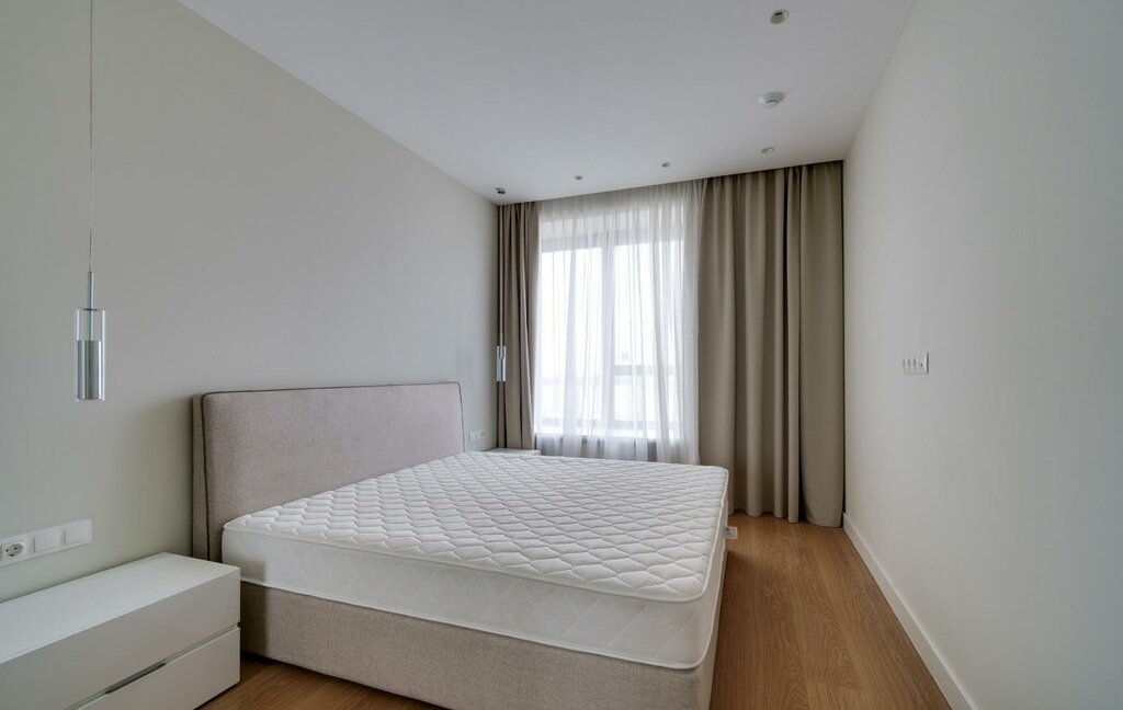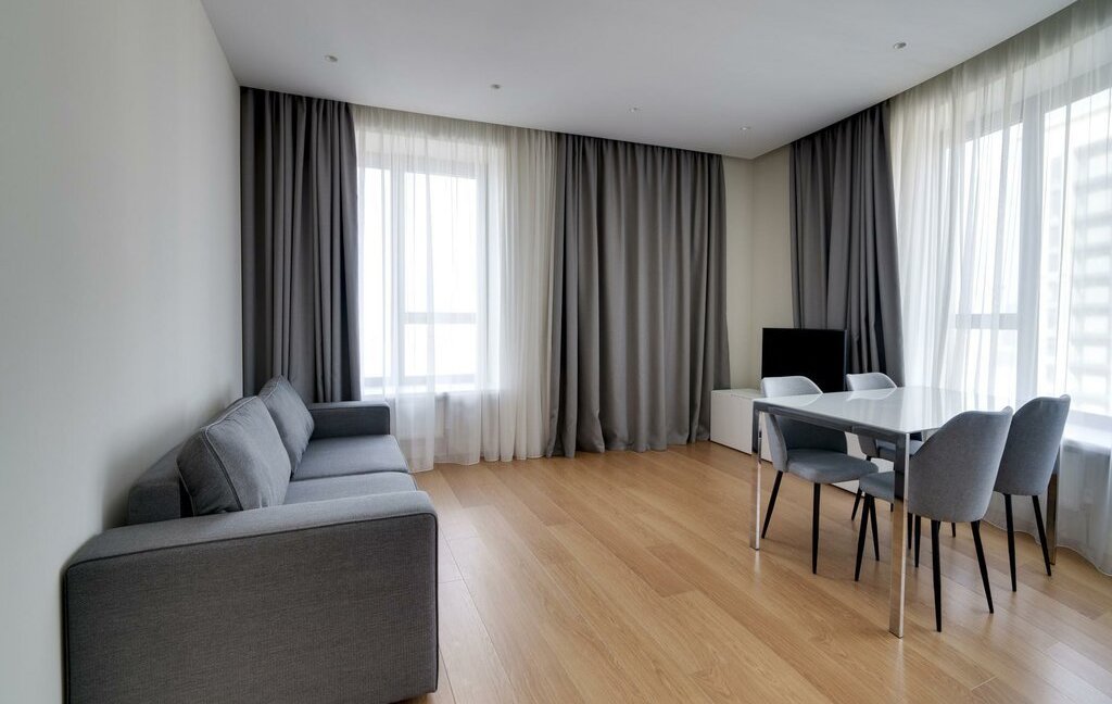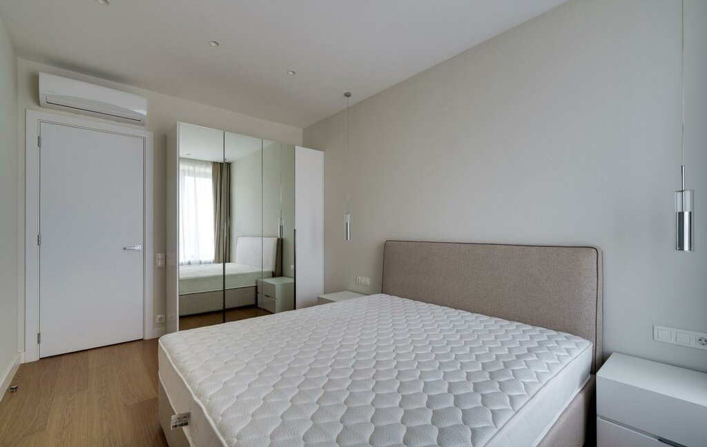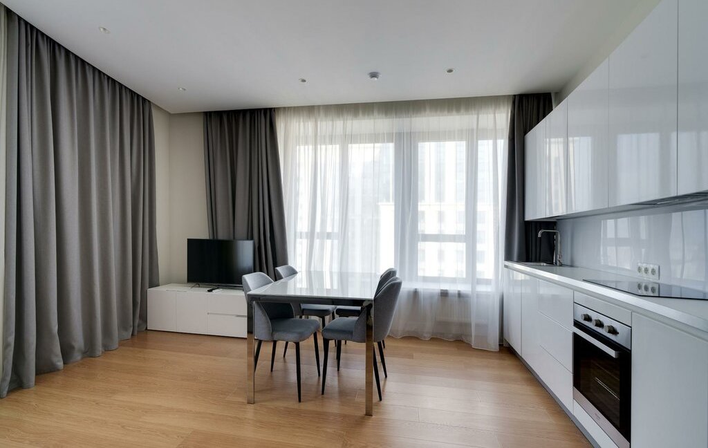 Предлагается в аренду угловая 2-комнатная квартира №3465 с евро планировкой (кухня-гостиная + 1 спальня) с высокими потолками и приятным видом на обустроенный внутренний двор площадью 60 м2, расположенная на двадцать третьем этаже нового арендного дома Матч Поинт. Окна апартаментов выходят на обустроенный внутренний двор. Современный эргономичный дизайн, вся необходимая мебель, техника, разработанная с использованием умных технологий. Просторная кухня-гостиная оснащена встроенной техникой фирмы Hotpoint: 2-х камерным холодильником, варочной 4-х комфорочной панелью, духовым шкафом, посудомоечной машиной и вытяжкой. Мебель европейского производства: при входе в апартаменты расположен вместительный шкаф (Permo, Италия), стильный пуф, массив которого выполнен из бука и хвойных пород, материал обивки - ткань "гусиная лапка", панель вешалка, а также отдельная гардеробная комната (3,6 м2). Зона кухни оборудована комплектом кухонной мебели с белыми деревянными фасадами, обеденной группой на 6 персон: прямоугольный стол с белой стеклянной столешницей и удобными стульями с мягкими тканевыми сиденьями коллекции MASON. В апартаментах предусмотрены два спальных места: в гостиной двуспальный раскладной диван (190 см * 150 см, механизм "еврокнижка", тканевая обивка Casain piain); в спальне большая кровать (180 см * 200 см) с мягким изголовьем и матрасом, выполненным из бельгийского материала с ортопедическим эффектом. Благодаря 5-ти зональному пружинному блоку матраса Ваш позвоночник будет получать превосходную поддержку. Помимо кровати в спальне из мебели есть прикроватные тумбочки со стильными подвесными светильниками над ними, шкаф с белыми премиальными глянцевыми фасадами и зеркалами (вся мебель фирмы Permo, Италия). Плазменный TV от Panasonic с TV тумбой дизайнеры разместили в гостиной. Для Вашего комфорта в каждой комнате установлен кондиционер. На окнах помимо тюли есть портьеры Design&Colors, SOLKLIMA DESEN. Совмещенный санузел оборудован ванной и раковиной, вместительной и удобной в использовании стиральной машиной, большим зеркалом с подсветкой.