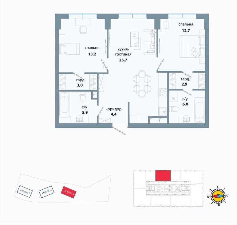 • Удобная планировка: коридор интегрирован в гостиную — пространство используется функционально, без узких проходных зон.