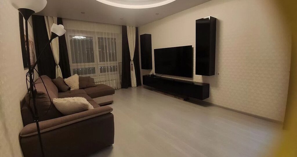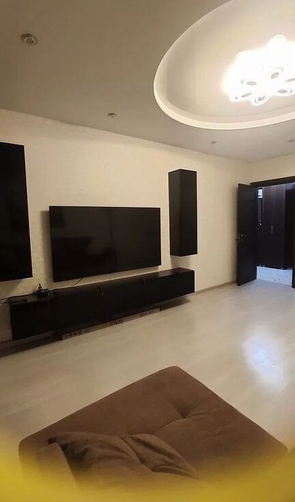 ️ уютная гостиная с диваном и большим телевизором, а также предусмотрены шкафы для хранения вещей