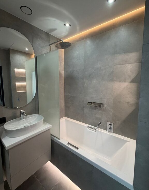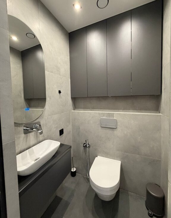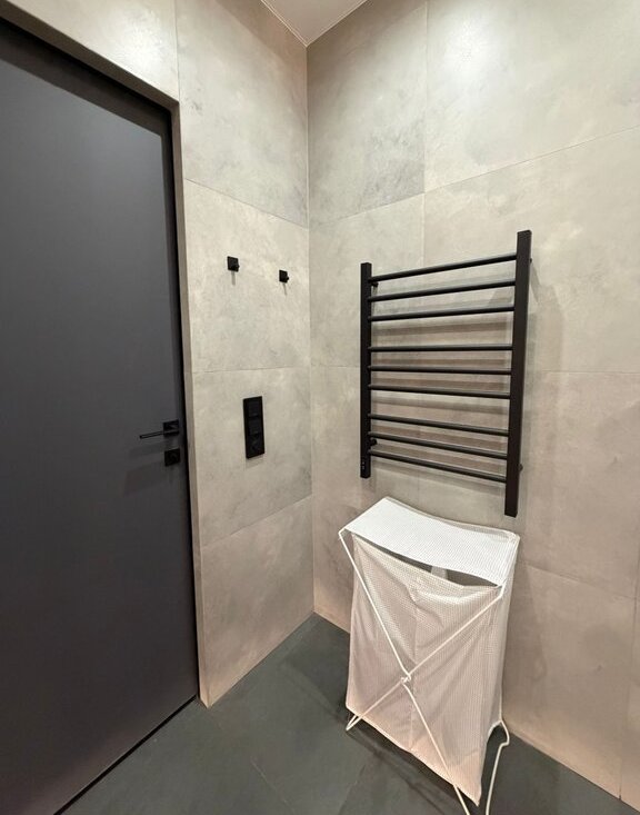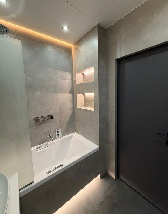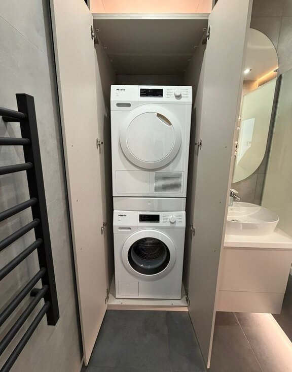 ванную комнату — современную, с ванной, качественной сантехникой, встроенными системами хранения и техникой Miele;