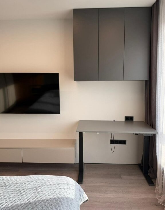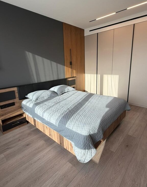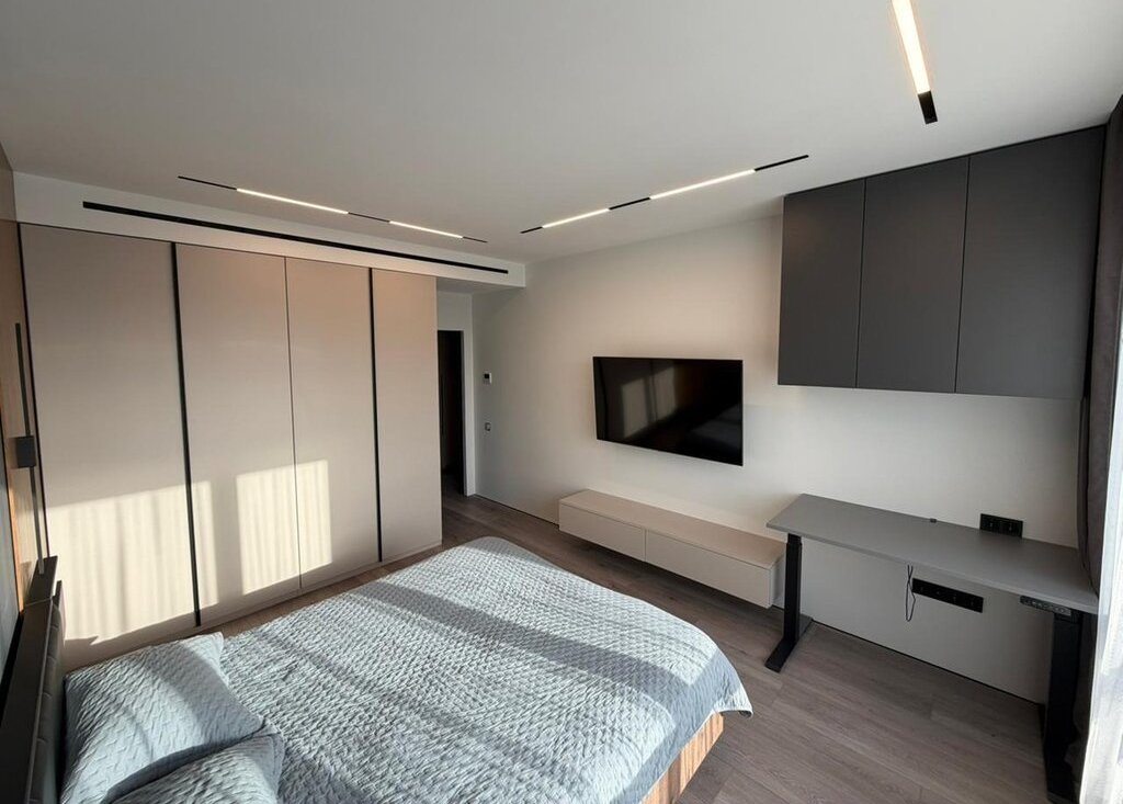 спальню — спокойную и комфортную, с рабочей зоной и встроенной мебелью;