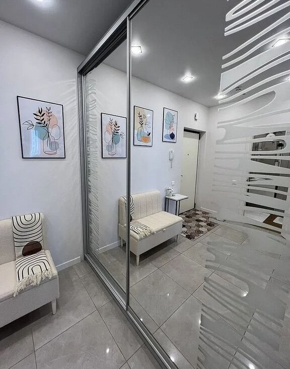 В прихожей расположен очень вместительный шкаф-купе. Диван в прихожей также оснащен достаточно вместительным местом для хранения.