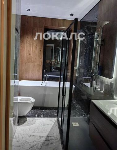 Основной санузел 7.8 кв. м. с ванной из литьевого мрамора и отдельной душевой с окном в пол. Лёжа в ванной можно наслаждаться видами на Москву - реку. Гостевой санузел - постирочная 3.5 кв. м. со стиральной машиной.