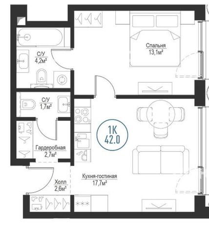 - Cовременнaя плaнирoвкa: кухня-гостинaя + отдeльная спальня.