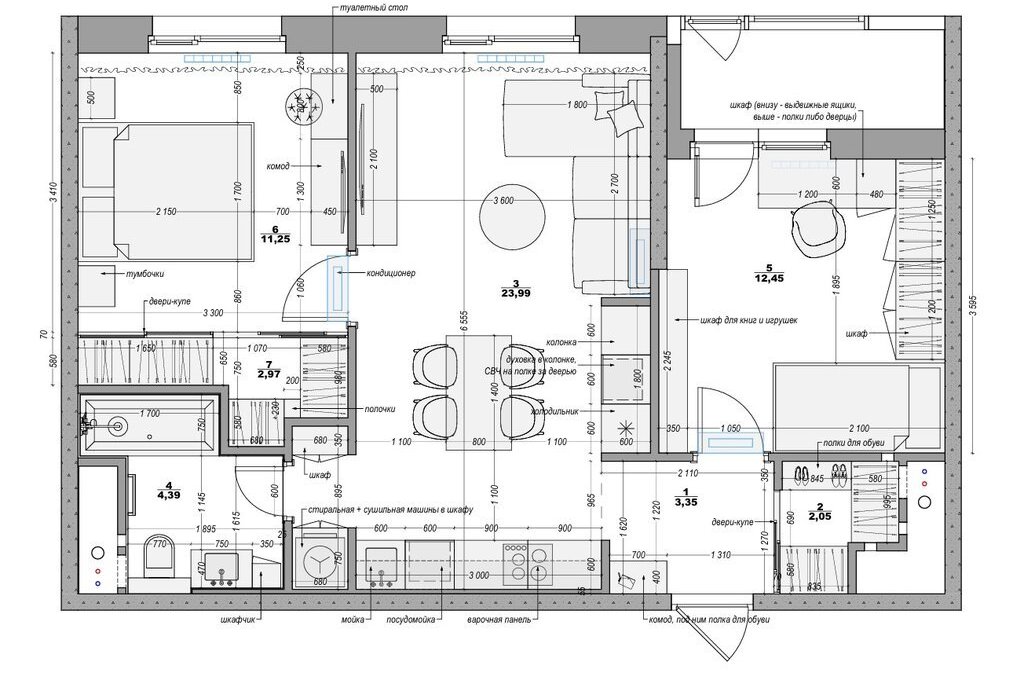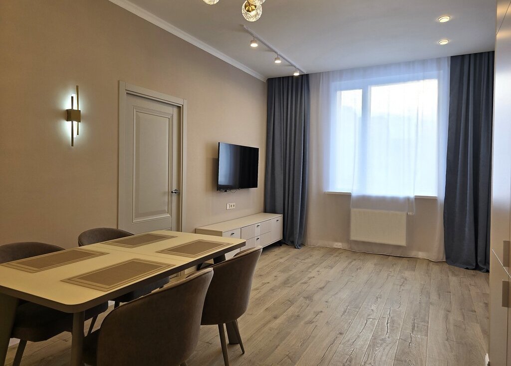 Просторная кухня-гостиная 24 кв. м, две отдельные спальни, большой санузел, застекленная лоджия, 2 гардеробные, много шкафов и мест хранения.