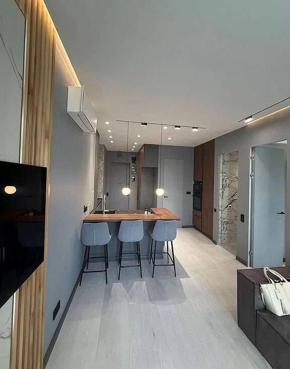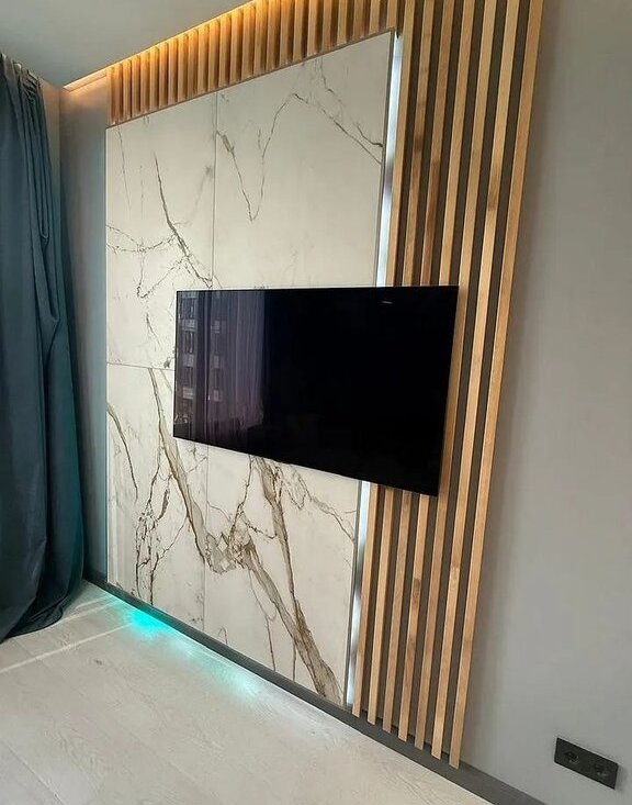 Дизайн: aккурaтнaя отдeлкa, aкцeнтная стена в гостиной с деревянными рейками и подсветкой.