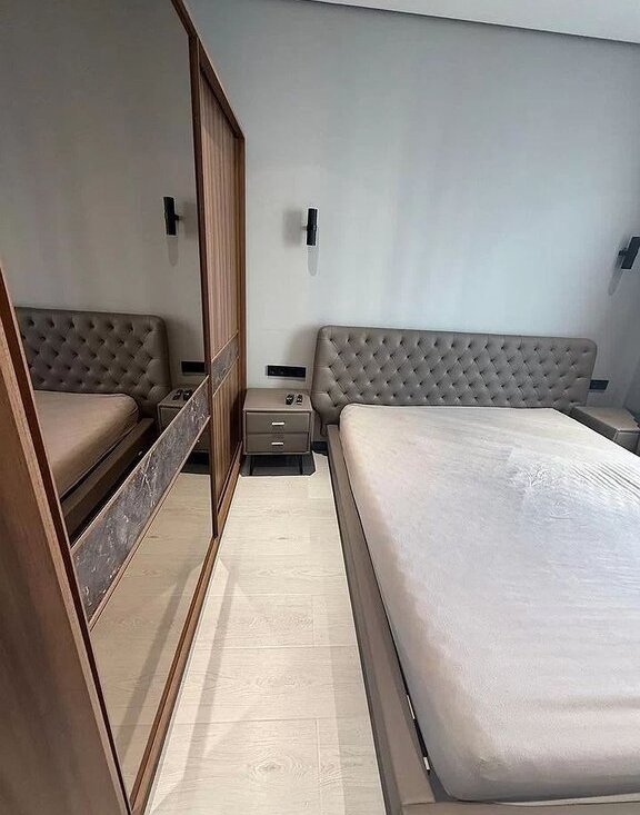 Планировка: спальня со спальным гарнитуром и большой двуспальной кроватью; гостиная‑кухня — простор и функциональность.
