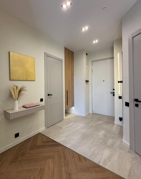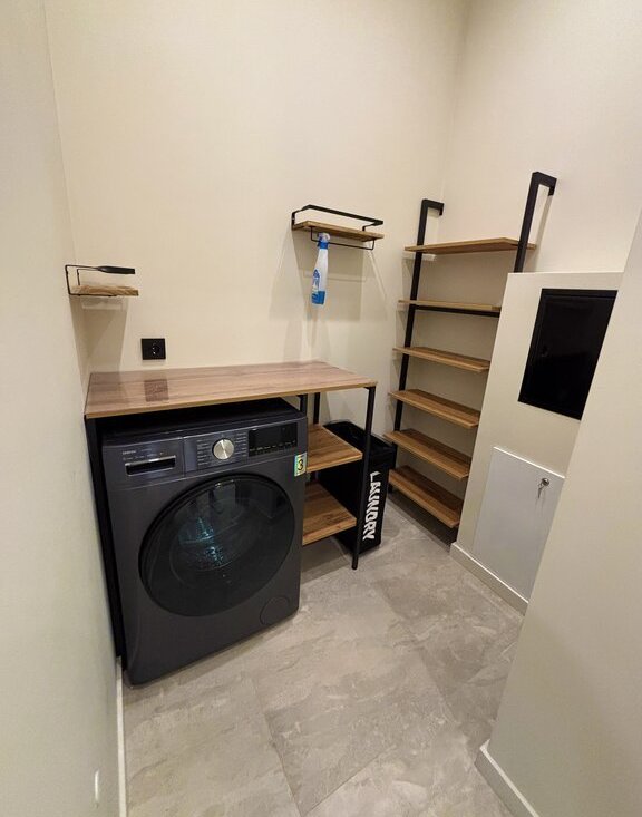 В квартире сделан дизайнерский ремонт, что позволило сделать не только просторный зал, переходящий в кухню, но и разместить вместительную гардеробную, вполне большую ванную, а также отдельную постирочную.