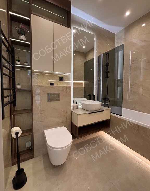 К тому же, все материалы очень качественные, это можно увидеть если пройтись по аналогичным квартирам и посмотреть, каким качеством керамогранита облицована ванная, какие плинтуса, фартук на кухне и материалы встроенной мебели.